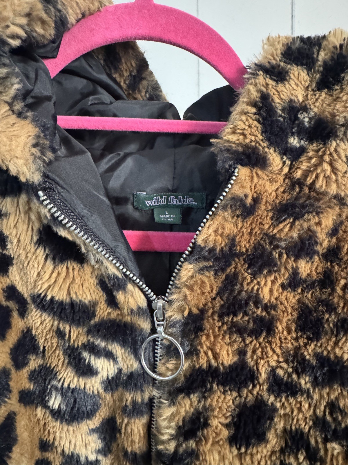 The Wild Fable Women’s Leopard Print Fuzzy Faux Fur Zip Up Jacket is a stylish and trendy addition to any wardrobe. This bomber jacket features a bold leopard print pattern with animal ears, making it a fun and fashionable choice for women. Made from polyester, this jacket is lined with cozy polyester material for added warmth and comfort. The hooded design adds a touch of versatility, while the zip up closure makes it easy to put on and take off. Perfect for adding a touch of wild flair to any outfit, this jacket is sure to make a statement in size large