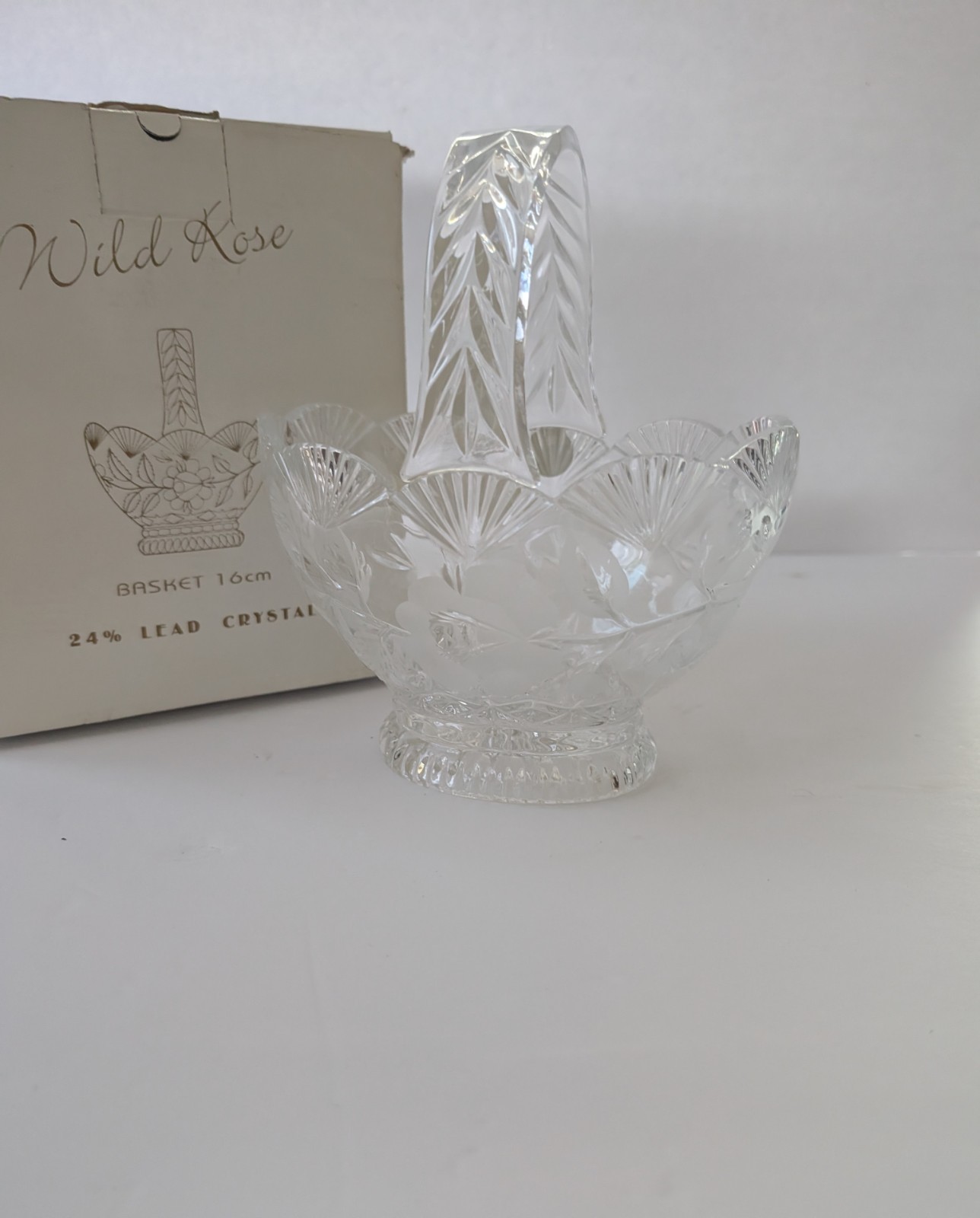 The Wild Rose 24% Lead Crystal Handled Candy Dish is a vintage piece made in Slovakia. This floral patterned candy dish features a clear, glossy finish and is made of crystal, adding an elegant touch to any room. The 16cm dish has one compartment and comes with a brand name of Wild Rose, perfect for serving candies or other small treats. With a production style of cut glass, this contemporary piece is a beautiful and unique addition to any collection of decorative cookware or serveware.