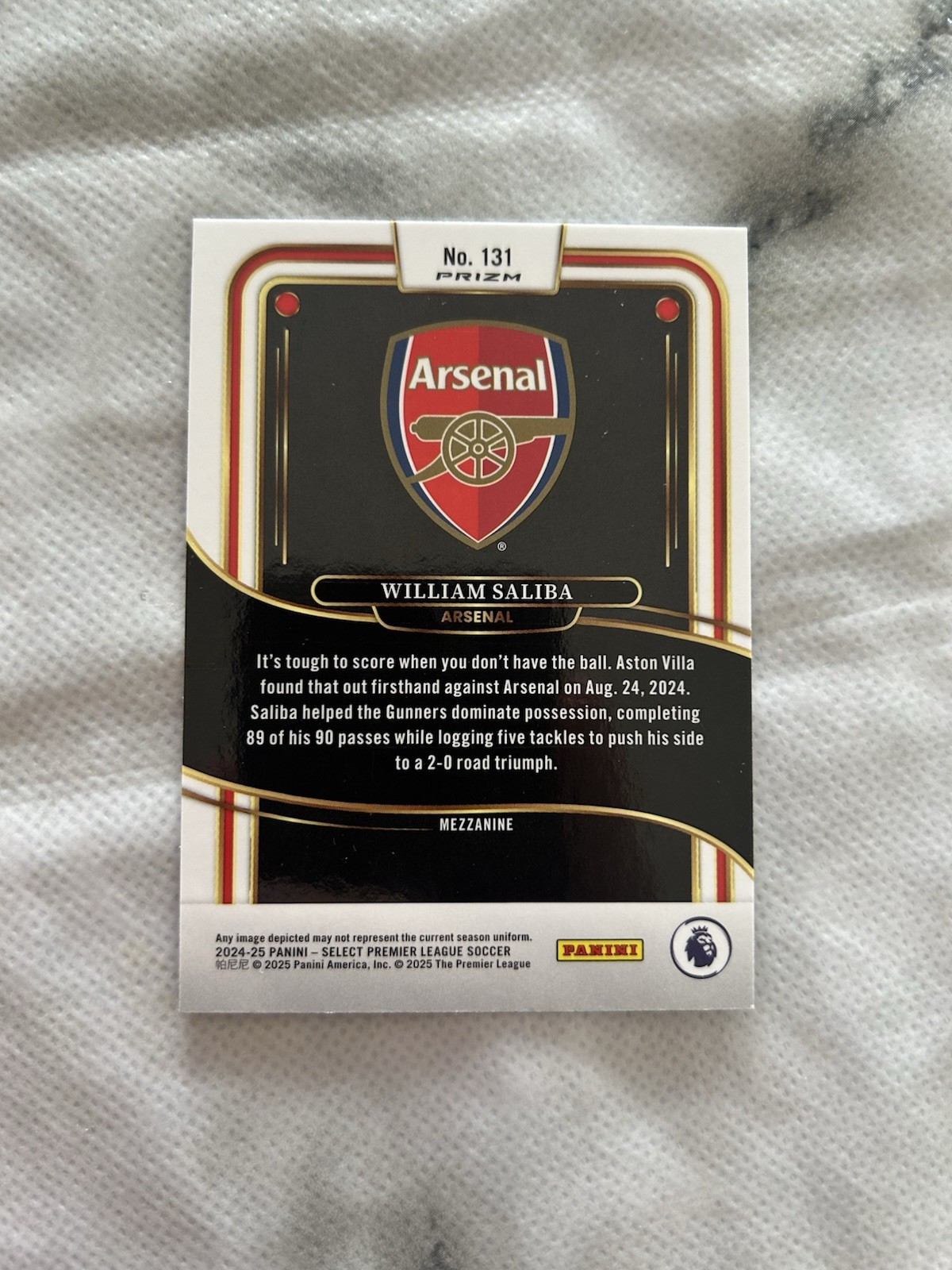 The William Saliba Blue Mezzanine Short Print Panini Select EPL 2024-25 Arsenal card is a sought-after sports trading card featuring the talented football player from Arsenal. As part of the 2024-25 Panini Select set, this original card is made of high-quality card stock with a thickness of 35 Pt. The card showcases an image of Saliba in his Arsenal club colours, making it a must-have for fans of the team. With its unique blue parallel variety and short print nature, this card is a valuable addition to any football card collection.