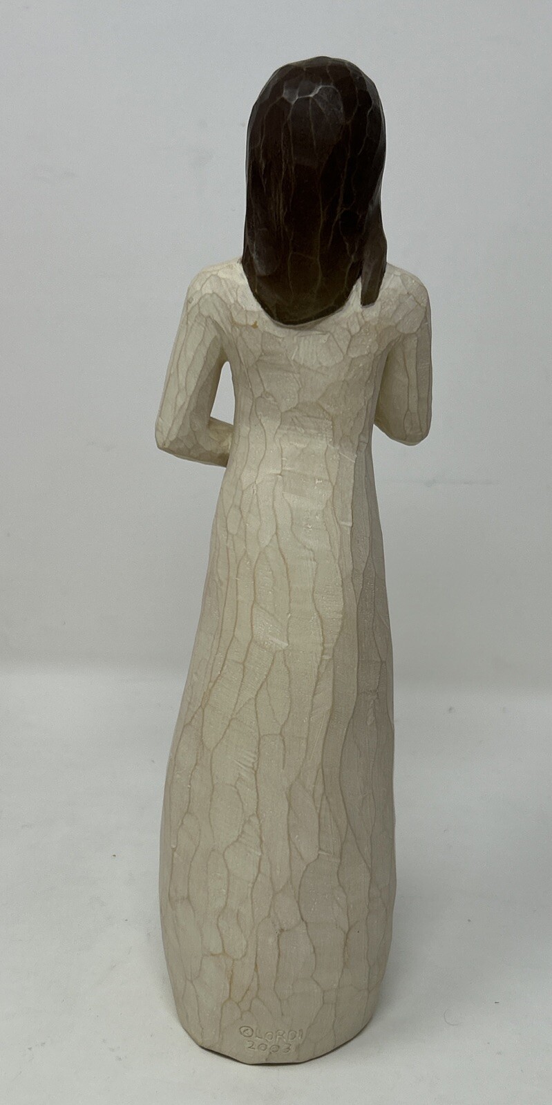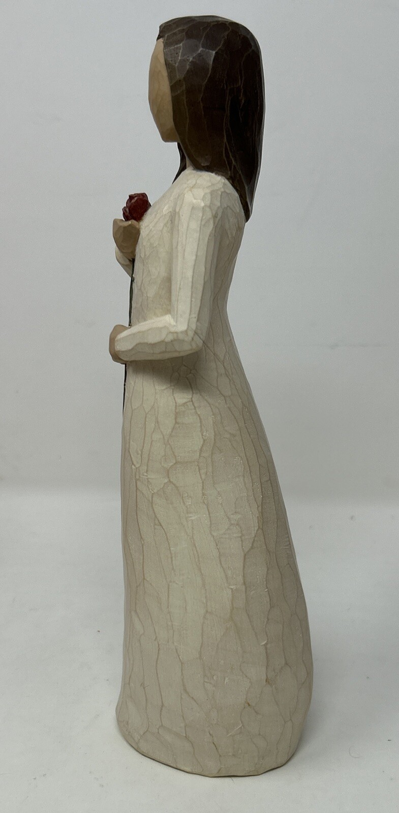 This beautiful Willow Tree figurine by Susan Lordi is a must-have for any collector. Titled "Love," it features a stunning abstract design with a single rose and a tan color finish. Measuring 9 inches in both height and length, it is the perfect size for display on any shelf or table. This figurine was manufactured in 2003 by DEMDACO and is part of the Willow Tree collection. It is an original piece and not a reproduction. The figurine is made of clay and has a matte finish. It is not handmade and was produced using job production techniques. This piece is perfect for all occasions and is a great addition to any decorative collection. Check pictures for condition and measurements for size.