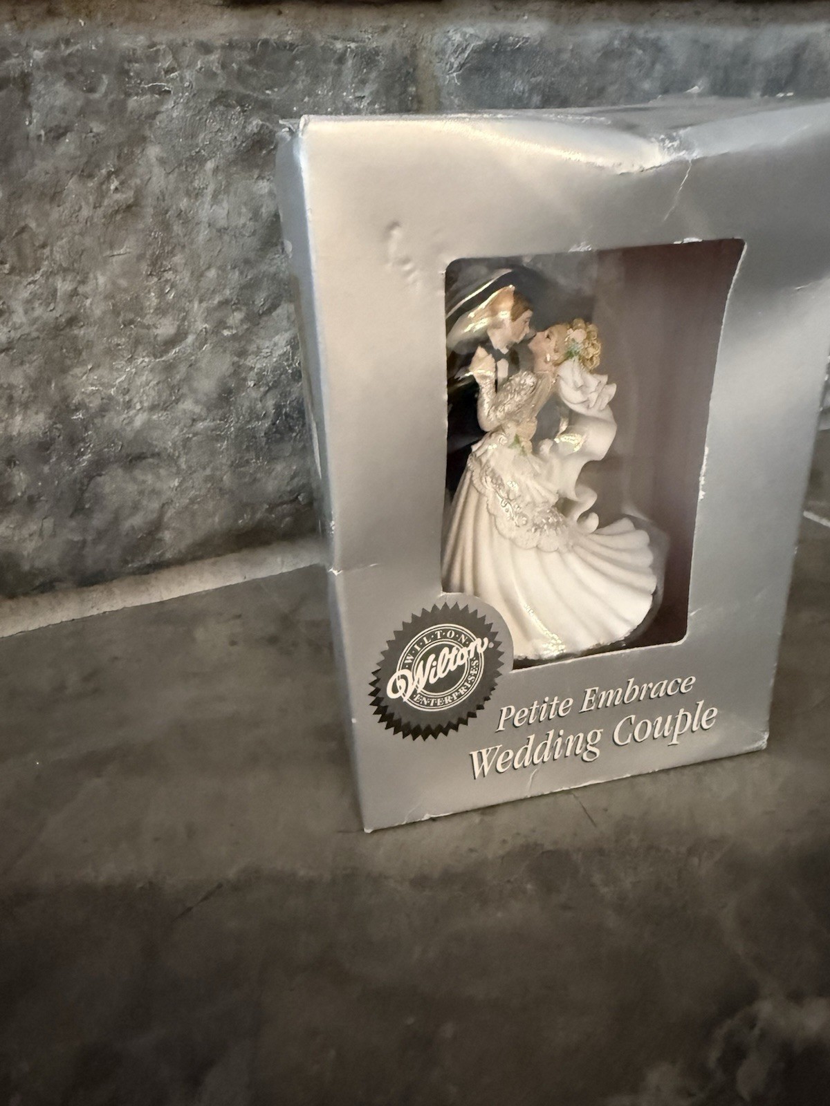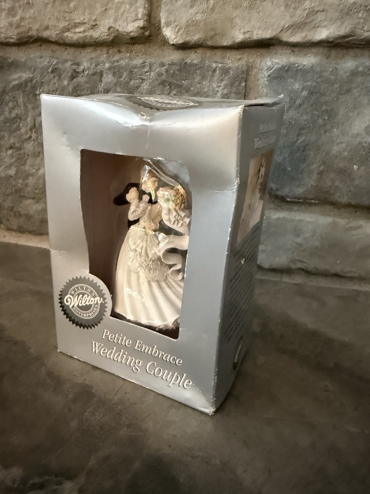 The Wilton Enterprises Petite Wedding Couple Cake Topper from 1998 is a classic resin piece measuring 4 inches in height. This elegant white and black wedding-themed topper features a bride and groom figurine, perfect for adding a personal touch to your wedding cake. Made by the renowned brand Wilton, this petite topper is a charming addition to any wedding celebration, adding a touch of romance and nostalgia to your special day.