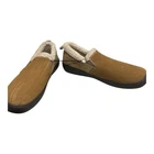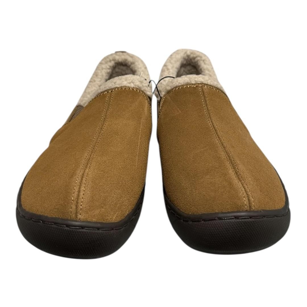 Brand: WindRiver Style: Mens shearling-style slip-on slippers with suede upper and indoor/outdoor rubber sole. Color: Brown upper with cream faux fur lining and black rubber outsole. Size: Mens US 9 as shown on the tag and outsole. Materials: Cow suede and textile suede upper, faux fur lining and insole, rubber outsole. Details: Closed toe design, low-back clog style, cushioned faux shearling-style interior, elastic side gores for comfort, heel pull tab, WindRiver logo tag at footbed and branded hang tag inside. Country of manufacture: Made in China.