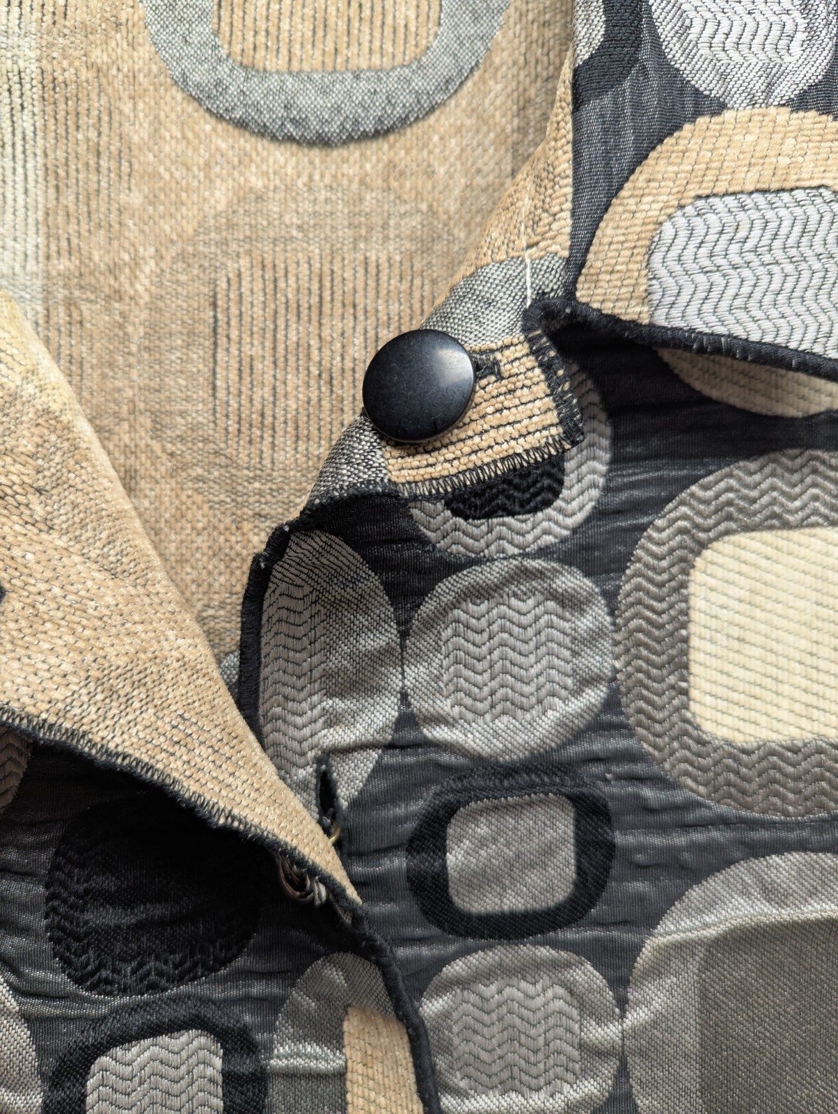 The Winding River Reversible Tapestry Coat Jacket is a mid-length, abstract geometric art piece tailored for women. Made with a tapestry outer shell and polyester lining, this multicolor jacket features a button closure, collared neckline, and has two sets of buttons. Its versatile design makes it suitable for various occasions such as travel, parties, and casual wear. With a size L and regular fit, this unique and stylish coat is perfect for all seasons, adding a touch of flair to any outfit.
