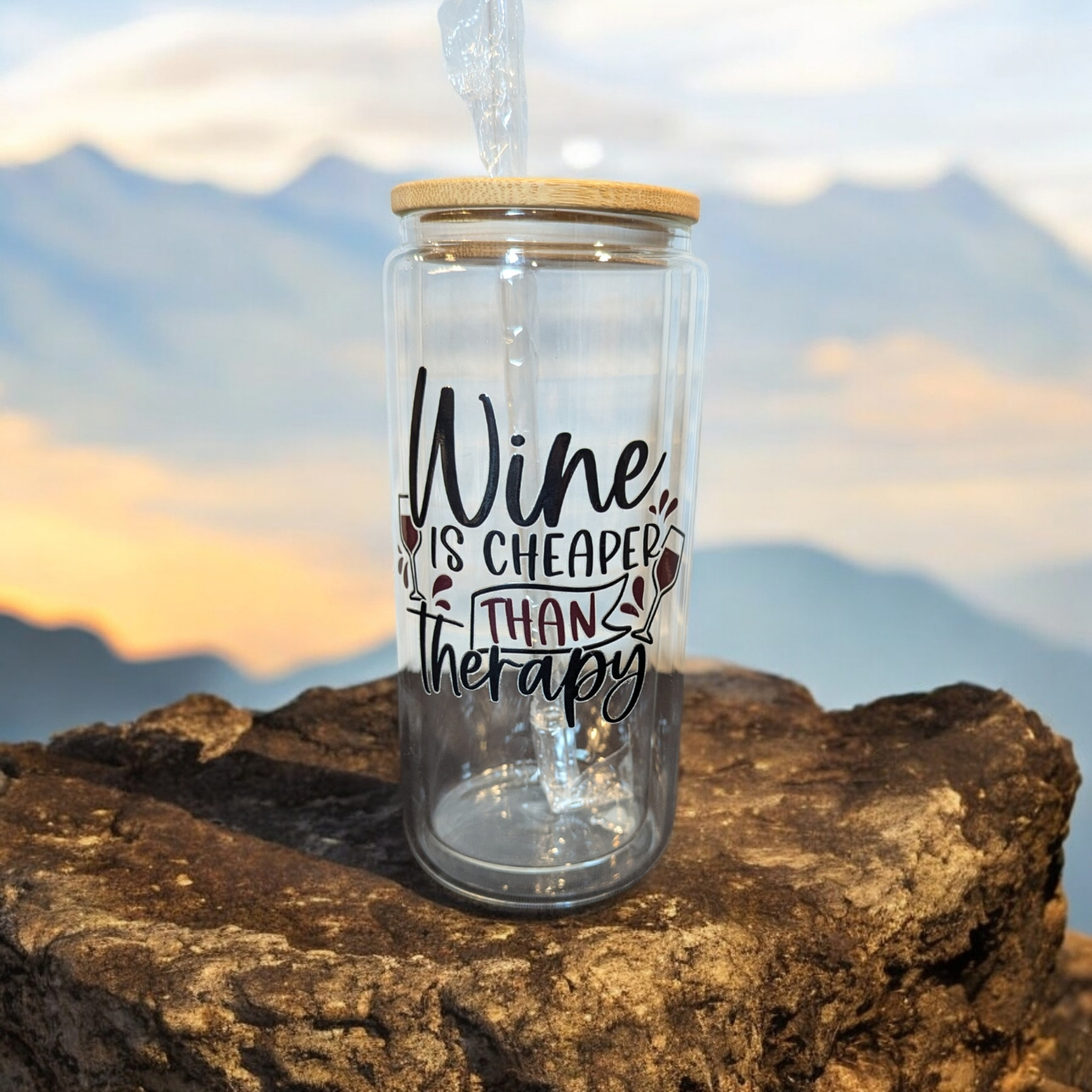 Description: Sip in style with this Glass Can Snow Globe Double Wall 20 oz Tumbler , featuring the playful slogan, "Wine is Cheaper Than Therapy"! Perfect for wine lovers and anyone who enjoys a little humor with their drink, this unique tumbler is designed with a double-wall structure to keep your beverages at the perfect temperature while adding a fun snow globe effect. Whether you're enjoying wine, cocktails, or any cold beverage, this 20 oz tumbler is ideal for both casual sipping and festive gatherings. The double-wall insulation helps to keep drinks cold longer while preventing condensation, making it a practical yet stylish choice for everyday use or as a thoughtful gift. Features: Material: High-quality glass with a double-wall design Capacity: 20 oz, ideal for wine, cocktails, or any cold beverages Design: Fun snow globe effect with the slogan "Wine is Cheaper Than Therapy" Insulation: Double-wall construction keeps drinks cold longer and prevents condensation Lid: Spill-resistant lid for easy, on-the-go use Perfect For: Wine lovers and humor enthusiasts Unique drinkware for parties, picnics, or everyday use Fun gifts for friends, family, or co-workers Keeping drinks cold and stylish at the same time Add a little sparkle and humor to your day with this Glass Can Snow Globe Double Wall 20 oz Tumbler —because "Wine is Cheaper Than Therapy" and your drinkware should be as fun as your wine!