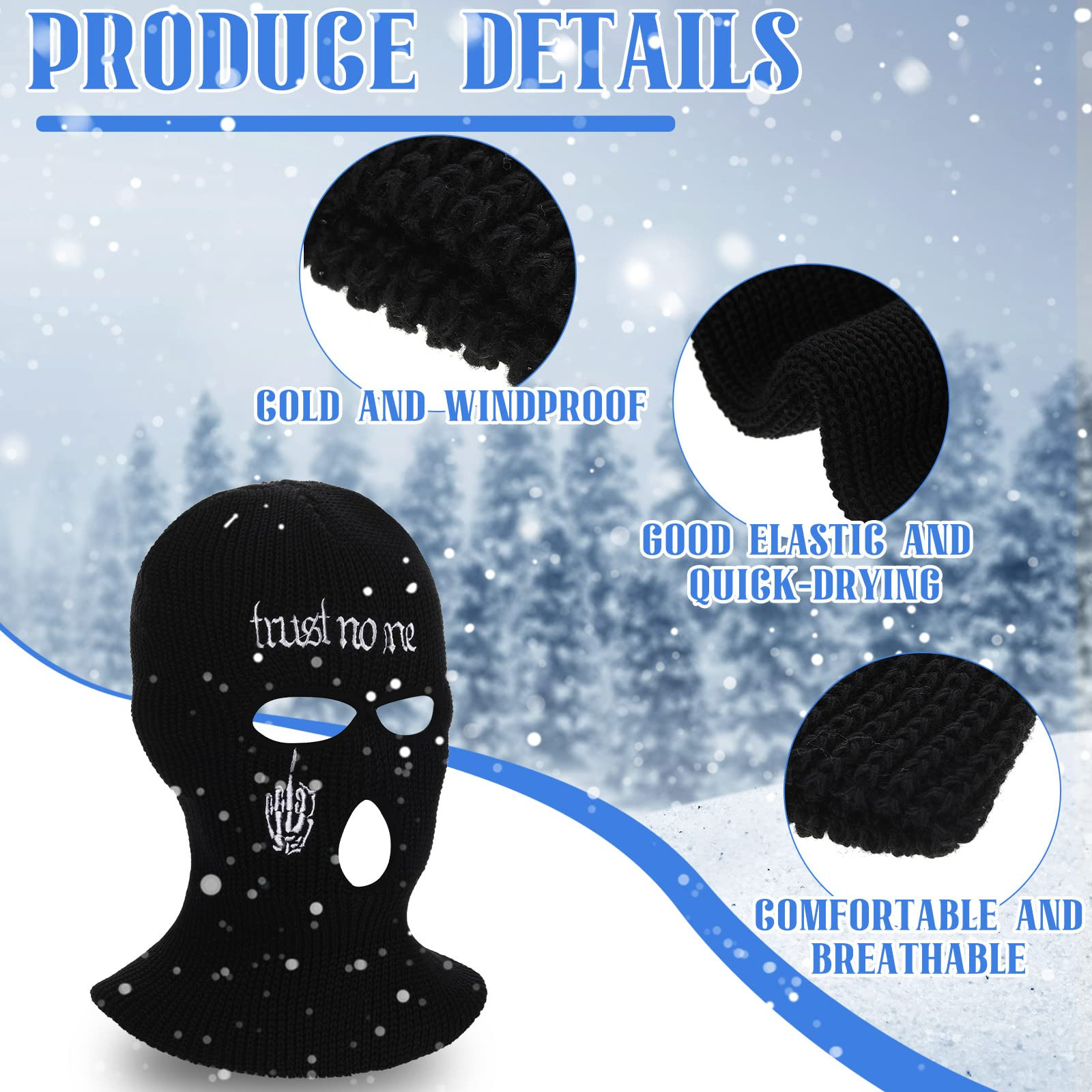 Comfortable Fabric to Serve You: each balaclava ski mask is made of acrylic yarn material, breathable and soft, lightweight and reliable, comfortable to touch, not break or fade easily, bringing you a pleasant wearing experience One Size to Fit Most: the balaclava face mask is in proper size which can fit most people, like women and men; It is stretchy, so it can fit your head circumference; You can carry it with you easily because it does not take up too much space 3 Hole Design: the ski mask for women is designed with 3 hole style; It can cover your head fully to keep you warm, with 3 hole design, you can breathe easily; It is convenient for you to see something with your eyes and eat something with your mouth, flexible and practical Wide Range of Application: the balaclava winter ski mask is not only suitable for daily wear, like going to offices and so on, it is also suitable for outdoor activities such as skiing, mountaineering, camping, hunting and more Practical Gifts: the full face knit mask is suitable for you to send to your friends, family members, relatives, lovers and other people on Christmas, Halloween, Thanksgiving and more, showing your sincere care to them
