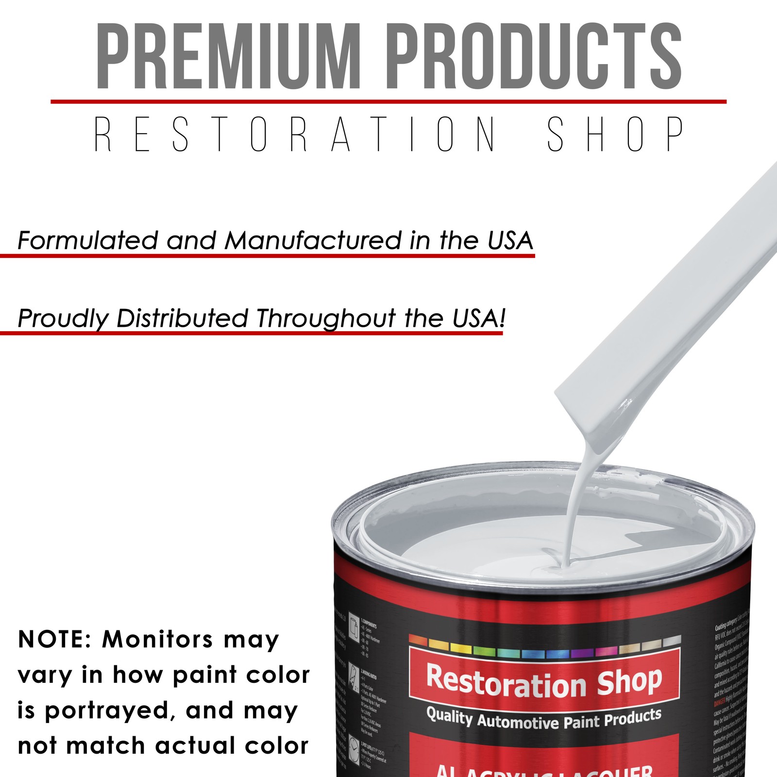 TCP Global Ebay Storefront Ordering | Shipping | Returns | International Product Information Part# RSP AL1103-KIT-S Winter White - Acrylic Lacquer Auto Paint - Complete Gallon Paint Kit with Slow Dry Thinner - Professional Automotive Car Truck Refinish Coating Complete 1 Gallon Restoration Shop Acrylic Lacquer Auto Paint Kit with Slow Dry Thinner. This Acrylic Lacquer (AL) Kit has a 1 to 1 mix ratio, so it provides two gallons of sprayable material. NOTE: Kit Not Available for purchase in California. A Low VOC paint is available for California purchases. The AL Slow Paint Kit includes 1 Gallon of AL Acrylic Lacquer Paint Color, 1 Gallon of Slow Drying Thinner (RSP LT85-GL), 5 Pack of 190 Micron Nylon Automotive Strainers and a 5 Pack of Wood Paint Mixing Sticks. The Restoration Shop (AL) Acrylic Lacquer System is a Professional Easy-To-Use Single-Stage Gloss Paint Coating System that is Designed for Automotive Refinishing and Restoration Purposes but is also used for Guitar and Furniture Refinishing. AL provides a long-lasting lacquer finish result that can be polished to a very high gloss. For additional color depth and extra protection for a show quality finish, AL can be clear-coated with CL3245 High-Performance Lacquer Clear (Not included, but available separately). Restoration Shop Products are Made in the U.S.A., and we formulate, manufacture, and distribute our products throughout the USA, unlike many competitors. Our superior coating products only use the highest quality ingredients, which allows our customers to achieve consistent, high-quality professional results on all their painting projects! Note: Monitors vary - onscreen colors are for general color reference only. CALIFORNIA RESIDENTS: This item is not compliant for purchase in the State of California. If your shipping address is a California address you CANNOT purchase this item. Your order will be cancelled, NO EXCEPTIONS . California residents must purchase our UBLV LOW VOC Compliant Paint. This Restoration Shop (AL) ACRYLIC LACQUER GALLON PAINT KIT Includes: 1 - Gallon of High-Performance Restoration Shop Acrylic Lacquer Auto Paint Color 1 - Gallon of Slow Drying Thinner (RSP LT85-GL) 5 - Each Premium 190 Micron Nylon Automotive Strainers 5 - Each Wood Paint Mixing Sticks NOTE: Kit Not Available for purchase in California. A Low VOC paint is available for California purchases. AL has a 1 to 1 mixing ratio, 1 part AL Paint Color to 1 part of Slow Drying Thinner (RSP LT85-GL) This Acrylic Lacquer (AL) Kit includes the exact amount required to make two gallons of sprayable material. Restoration Shop (AL) Acrylic Lacquer Paint System AL is a Professional Easy-To-Use Single-Stage Gloss Paint Coating System that is Designed for Automotive Refinishing and Restoration Purposes but is also used for Guitar and Furniture Refinishing. AL provides a long-lasting lacquer finish result that can be polished to a very high gloss. For additional color depth and extra protection for a show quality finish, AL can be clear-coated with CL3245 High-Performance Lacquer Clear (Not included, but available separately). Optional Medium Drying Thinner is Available Separately LT70 Medium Thinner for 70-85¡ F Note: Monitors May Vary in How Paint Color is Portrayed, and May Not Match Actual Color. All Restoration Shop stock paint colors are inspired and named after popular classic color names and are Not Made to Match O.E.M Paint Manufacturers Color Codes. Flammable and Hazardous Items Will Be Shipped By UPS Ground Only and Only Within The Lower 48 U.S. States and Canada. Since 1974, Restoration Shop has been a Trusted Top Quality Brand and The Source for Innovative Premium Quality Automotive Products! Save up to 70% on products that meet or exceed the performance of the more expensive name brands! Our premium quality coating products are Made in the USA, and we formulate, manufacture, and distribute our products throughout the USA, unlike many competitors. Our superior coating products only use the highest quality ingredients, which allows our customers to achieve consistent, high-quality professional results on all their painting projects! With over 288 stock colors, and a custom Auto Color Library database going back into the early 1900s, there is no other place for your automotive paint needs. FLAMMABLE/HAZARDOUS ITEMS ARE SHIPPED VIA UPS GROUND/STANDARD TO THE LOWER 48 U.S. STATES & CANADA. ***SHIPPING VIA U.S. POSTAL SERVICE OR TO A P.O. BOX IS NOT AVAILABLE.*** RUSH AIR SHIPPING IS AVAILABLE IN CONTINENTAL U.S. FOR AN ADDITIONAL HAZMAT AIR SHIPPING CHARGE. CONTACT US PRIOR TO ORDERING FOR AIR SHIPPING QUOTE. IF ORDER IS PLACE FOR AIR SHIPPING YOU WILL BE CONTACTED FOR ADDITIONAL SHIPPING PAYMENT. INTERNATIONAL SHIPPING IS AVAILABLE. CONTACT US FOR SHIPPING QUOTE PRIOR TO ORDERING. View all categories Warehouse Locations Las Vegas, Nevada South Carolina