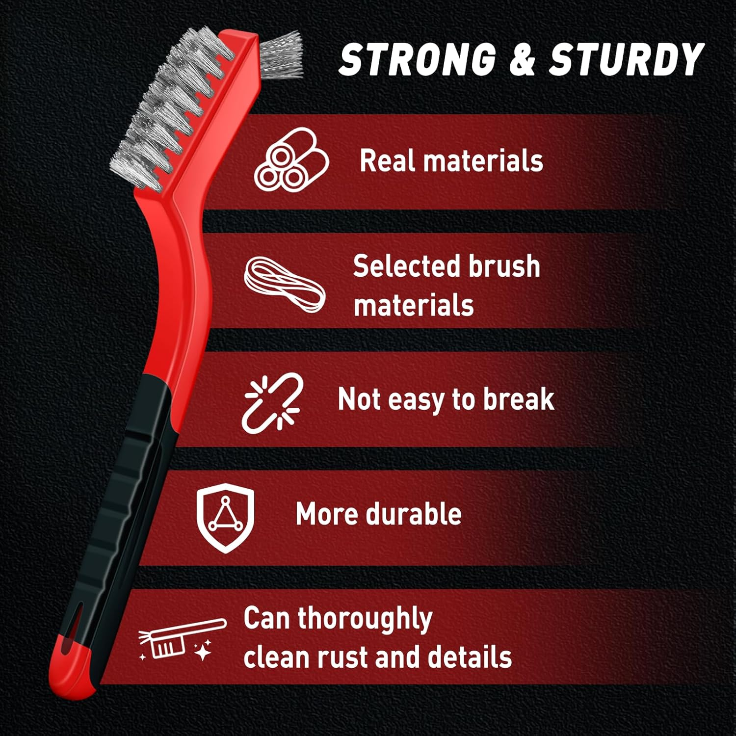 Cleaning Brush Set: The kit includes 3 wire brushes with three different types of bristles - brass brush, stainless steel brush, and nylon brush. Made of high-quality materials, sturdy and durable, it can be used for a long time. Suitable for different surface types, they will be your good cleaning helper. Multiple Uses: Each type of wire brush is designed for different cleaning tasks. The small brass wire brushes for cleaning small parts is an ideal choice for cleaning metal surfaces without scratching them. The stainless steel wire brushes can be used for rust removal and removal of stubborn stains. The soft nylon brush is very suitable for mild cleaning of household appliances. Ergonomic Design: The slightly curved handle of the thin metal brush for cleaning provides a comfortable grip, allowing you to apply appropriate pressure during long-term cleaning and ensuring the safety of your finger joints during use. The plastic handle of the stiff metal brush for cleaning is covered with a soft rubberized layer that is non-slip, making the cleaning brush easy to operate and control, and improving work efficiency. Portable Size: The total length of the little steel brush for cleaning is 7 inches, the brush head is 1.7 inches, the handle length is 5.1 inches, and the tail hook design is convenient for organization and storage. The scratch brush for cleaning is lightweight and portable, and can be easily put into a toolbox or handbag for reuse. Whether you are going to the office or cleaning at a friend's house, our mini wire brush set can go with you. Wide Application: The wire brush set is very suitable for removing paint, rust, scale, and metal burnishing. Each small cleaning brush has a small top brush for detail work, and the bristles are small enough to reach tight spaces and hard-to-reach areas.Whether it's the garage, kitchen, or bathroom, our brushes can meet your cleaning needs in various situations. Product Description