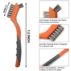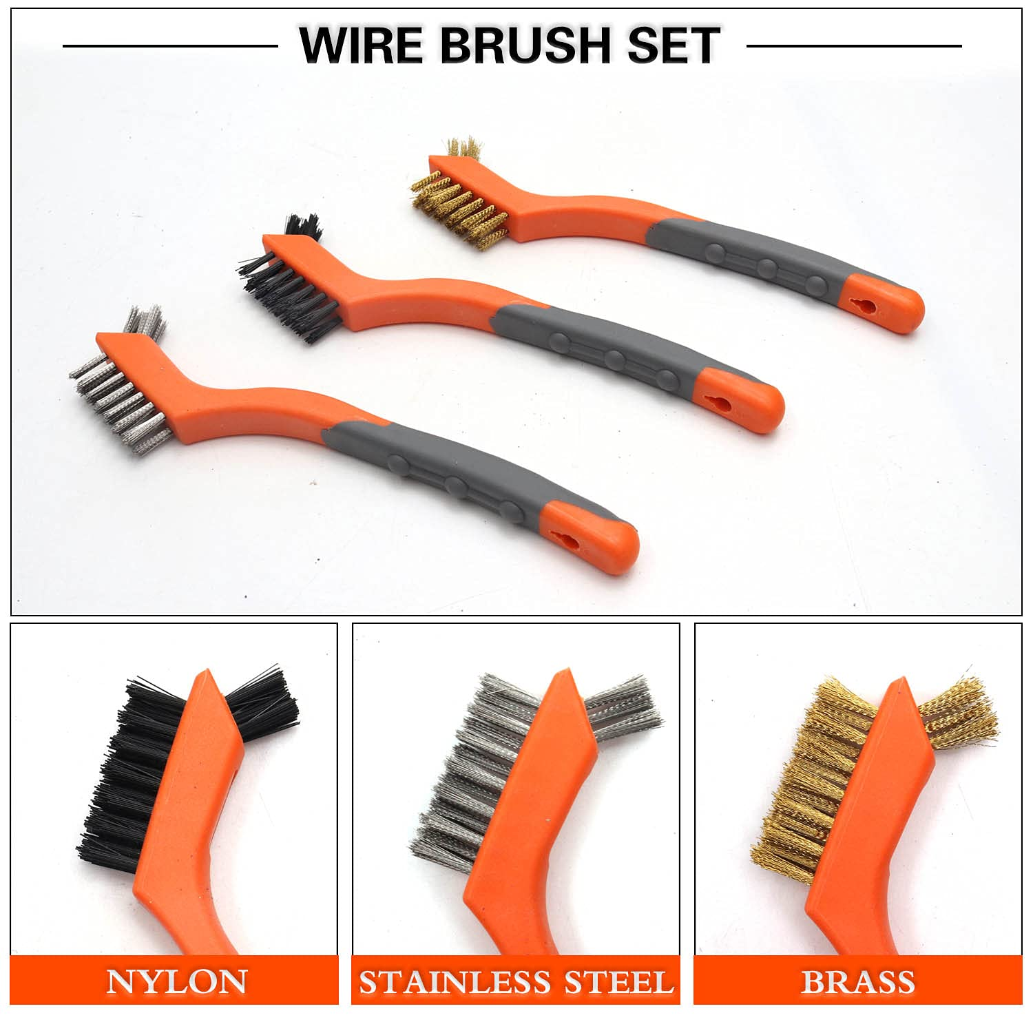 5 PACK OF 2 DIFFERENT SIZE -2PCS 10" 4X16 Rows of bristles heavy duty Carbon Steel and Stainless Steel medium-sized wire brushes suitable for larger projects and some rigid surfaces; 3PCS 7" mini brushes have several applications, perfect for smaller cleaning tasks, Each brush has the small top brush for detail work, the brushes were small enough to get into all the tight spaces that are hard to reach and clean, easily cleaning small spaces and narrow corners, nook ,cranny, Grooves. 3 DIFFERENT BRISTLE TYPES - Gold brass bristles, Black nylon bristles, Silver stainless steel bristles; the varying bristle flexibility and stiffness helped to clean up a variety of surfaces, Good assortment of bristles for cleaning any surface you need. DIFFERENT BRISTLES FOR DIFFERENT NEEDS-the Stainless steel is awesome on scrubbing Rust and corrosion; the brass bristles is great for cleaning metal mechanical parts dirt, and paint stripping, would not damage the steel part; Nylon bristles is softer than other two steel brush and perfect for gentle cleaning, The nylon bristles also tend to be chemical resistant so can be used with many solvents. NON-SLIP AND COMFORTABLE RUBBER HANDLE - These curved plastic handles with a rubberized coating which are easy to grip with or without gloves, which really helps when you are scrubbing and your hands are wet and slippery. ADVANCED MATERIALS AND NICE DESIGN - The exquisite orange and gray combine makes them instantly recognizable from your toolbox, We are a professional brush manufacturer since 1992, MAXMAN Factory has specialized in creating finest quality Wire brush, paint brush, All kinds of brushes, It integrates product development, designing, production, sales trade and one of supplier of big hardware market in U.S.A. Product Description Details Stiff Bristle Strong, durable and effective.V ery tough carbon steel and Stainless Steel brush for heavy duty metal polishing, grill cleaning, etc. Plastic Handles with Finger Grips The handle is very comfortable to grip, easy to hold. Holes for Hanging