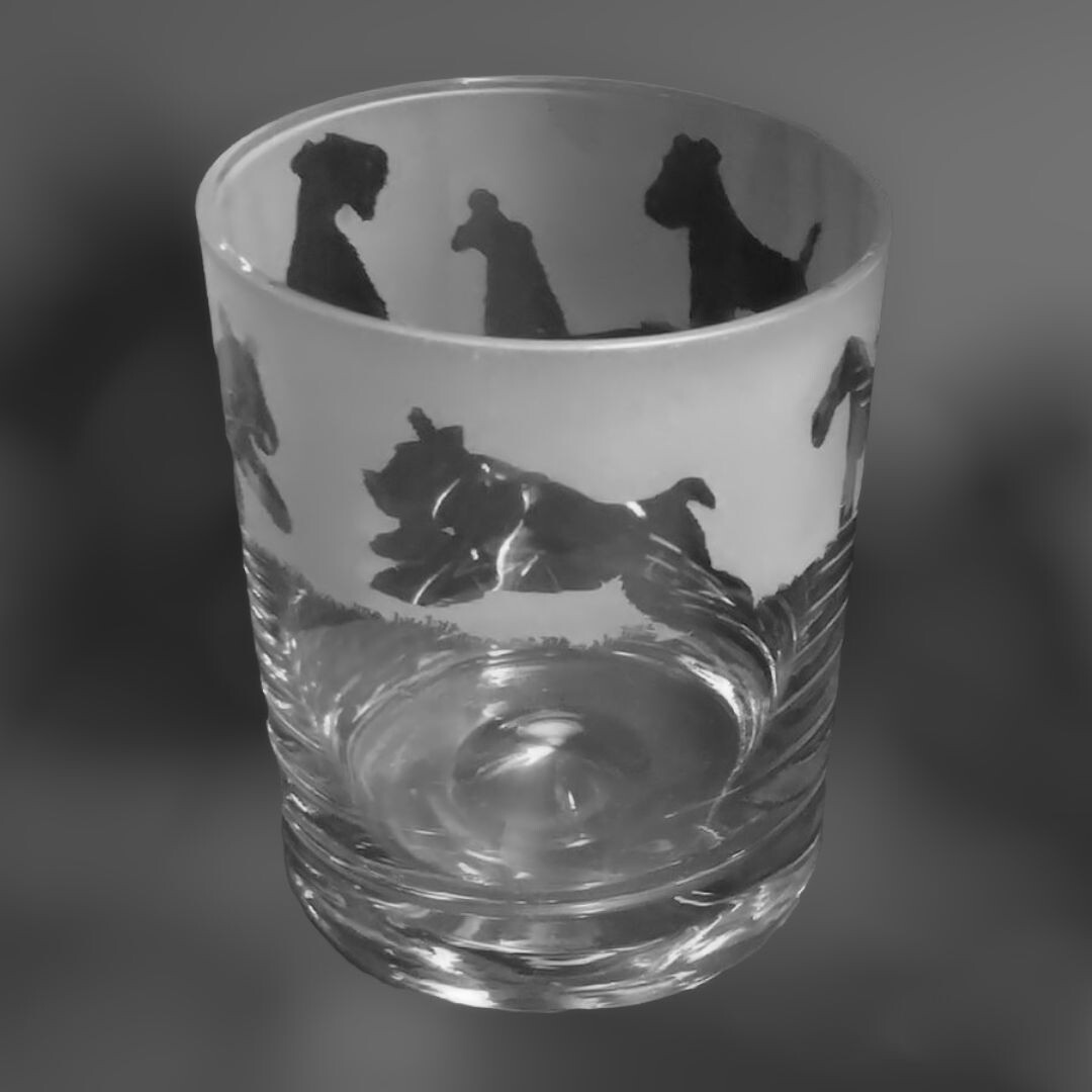 Boxed 30cl Glass Dimple Base Whisky Tumbler with Wire Fox Terrier Frieze My designs are unique and make special gifts for your loved ones. Each design has been created and drawn by me, and every piece of glassware is carefully engraved by hand using sandblasting techniques devised by my father fifty years ago to ensure a high quality finish and fine detail, which cannot be achieved with laser engraving. The frosted area has a smooth even finish enhancing the fine detail of the engraving and is engraved in the UK by me at the Great British Glass workshop in rural Norfolk. The hand decorated nature of my items means that there may be small differences between glasses, which is a perfectly normal part of the hand made process. Height 100mm approx Each item of glassware is supplied tissue wrapped in a card carton, and is then carefully wrapped in biodegradable bubble wrapper and secured in a card shipping carton sealed with Kraft paper tape printed FRAGILE to ensure safe transit. Breakages are extremely rare and all of the packaging can be recycled or biodegrades. In the unlikely event an item arrives broken please contact me with pictures of the breakage and any damage to packaging as these will be required for my claim with the relevant carrier. If your order is needed for a specific date please let me know and I will always do my best to ensure your required by date is met - I do offer some expedited shipping options in the checkout for UK deliveries. Thank you so much for purchasing from a small business producing high quality hand decorated items in the UK. Your custom is really appreciated. fox terrier gifts for her, fox terrier lovers gift, fox terrier glass gift, crystal glass fox terrier gift, fox terrier home decor, fox terrier tableware, fox terrier glassware, fox terrier wine, fox terrier water, fox terrier merchandise, fox terrier owner gifts, fox terrier prizes, fox terrier gift ideas, fox terrier items for sale, fox terrier gifts for him, fox terrier gifts for women, fox terrier gifts for best friends, fox terrier gift idea, fox terrier home decor fathers day gift idea, 1st fathers day gift, gift for dad under £20, gift for grandad on fathers day, gift for stepdad, mens gifts under £20