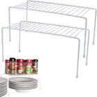 Set of 2 Instant Kitchen Shelf Organizer: Create hidden shelves for kitchen cabinet organizers and storage space for bins baskets and other closet racks for storage & containers. Smart pot and pan organizer for cabinet, baking cabinet shelf and can organizer shelving. Sold on Amazon for 8 over years Cabinet Storage: Use as a corner cabinet organizer , kitchen countertop organizer , table top , fridge / freezer kitchen organization and storage , medicine cabinet organizer , spice organizer for cabinet , and house office desk shelf organizer Holds About Anything: Organizes spices , dishes , small appliances , baby items, pots , pans, soup , soda cans and bottle , mug / cup , bread , paper products, snack and chips on kitchen shelves . Use as a plate organizer for cabinet or a basket holder and window plant stand Easy Fit: 10.5 Inches Long x 5 Inches Wide x 5.25 Inches High, it holds items in mini spaces. Great as a trailer pantry organizer, locker shelf, spice rack shelf, drawer divider, tea and coffee storage, medicine organizer cabinet, perfume and beauty containers From our Vermont home to yours: For over 10 years, Evelots has offered customers unique products with a 30-day easy return policy. Product Description Set of 2 Shelves About Us Evelots offers quality consumer goods to customers around the world. We are dedicated to making your shopping experience memorable. We stand behind every item we sell and want you to truly be satisfied with your purchase. EVELOTS SET OF 2 CABINET/COUNTER SHELF ORGANIZERS Color: White These helper shelves will double your space! Versatile shelves hold food, dishes, small appliances, pantry staples, toiletries, cleaning products, or anything you need to store in a small space. Perfect for maximizing storage and organizing kitchen cabinets, cupboards, pantries, bathroom cabinets, closets, countertops, under a sink, or anywhere you need extra room. Features: Simply place shelves where needed, no installation or hardware required. The perfect item to help optimize cabinet space and organize your kitchen. The shelf can store plates, cups, kitchen linens, and other kitchen items. Plastic feet keep shelves in place and won't scratch surface underneath. FREEZER SAFE Organize your freezer with these shelf dividers. No more mountains of frozen food stacked haphazardly falling out when you open the door. MEASUREMENTS Each shelf measures approximately 10.5 Inches Long x 5 Inches Wide x 5.25 Inches High. HIGH QUALITY MATERIAL Made of steel with a white PE plastic coating that cleans easily and won't rust or scratch delicate items, these shelves will be around for the long haul.