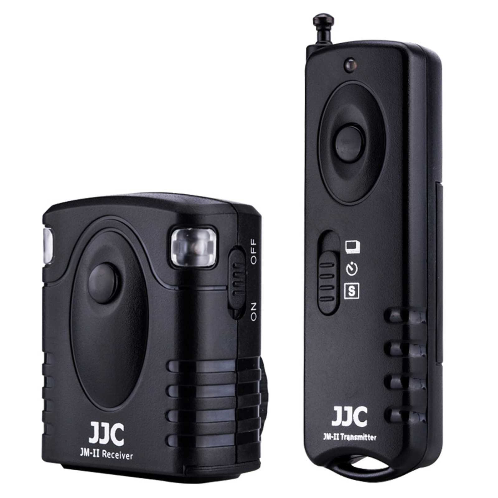 JM-II series Radio Frequency Wireless Shutter is designed for most DSLR and SLR cameras that have a remote socket on the camera body. The system works at 433MHZ frequency and has 16 available channels. What’s more, this wireless remote system allows the transmitter to trigger the receiver from 30 meters away. The JM-II receiver simply attaches to a compatible camera's accessory shoe, and then just connects the supplied receiver cable to the camera's remote socket. The receiver is powered by one piece of CR-2 lithium battery while the transmitter is powered by one piece of 23A battery. JM-II transmitter can trigger the camera shutter at five modes: single shot, 5 seconds delay shot, 3 continuous shots, unlimited continuous shots and bulb shot. The receiver has a 1/4"-20 tripod mount socket on the bottom, so you can even mount the receiver onto a tripod. Most importantly, our JM-II transmitter is able to fire multiple receivers at the same time. The receiver itself with the connecting cable can be used as a Wired Remote Switch, then half press to focus, full press to take a photo. All these features make it good for eliminating camera shake in long exposure photography. Compatible with below cameras: FUJIFILM X-M5/XM5/X100VI/X-H2 /X-H2S/ GFX100 / X-T30 II / X-T30 / GFX 50S / GFX50S II/GFX 50R / X-H1 / X-Pro2 / X-T5 / X-T4 / X-T3 / X-T2 / X-T1 / X-T20 / X-T10 / X-T100 / X-E3 / X-E2S / X-E2 / X-A5 / X-A10 / X100F / X100T / X70 / X30 / XF10 Package Contents: JM II transmitter x 1 JM II receiver x 1 CR-2 battery x 1 23A battery x 1 Connecting cord x 1 Manual instruction x 1 Can trigger cameras wireless or wired. Half press to focus, full press to take a photo Wired mode: The receiver itself with the 3.3ft connecting cable can be used as a wired remote switch and powered by camera, no battery is required Wireless mode: Both the transmitter & receiver need to be powered by their batteries 16 channels available, one transmitter can fire multiple receivers at the same time Max working distance 30 meters