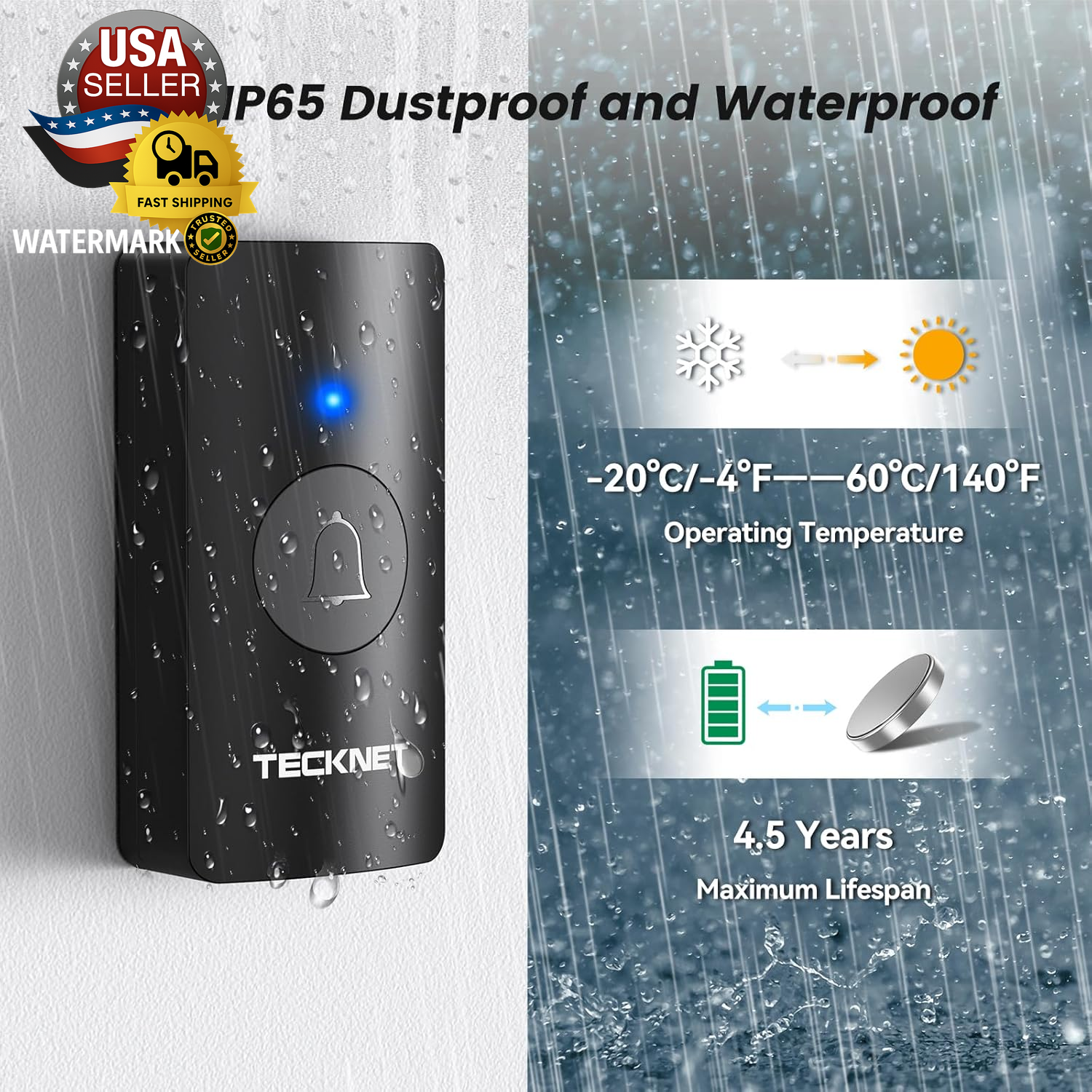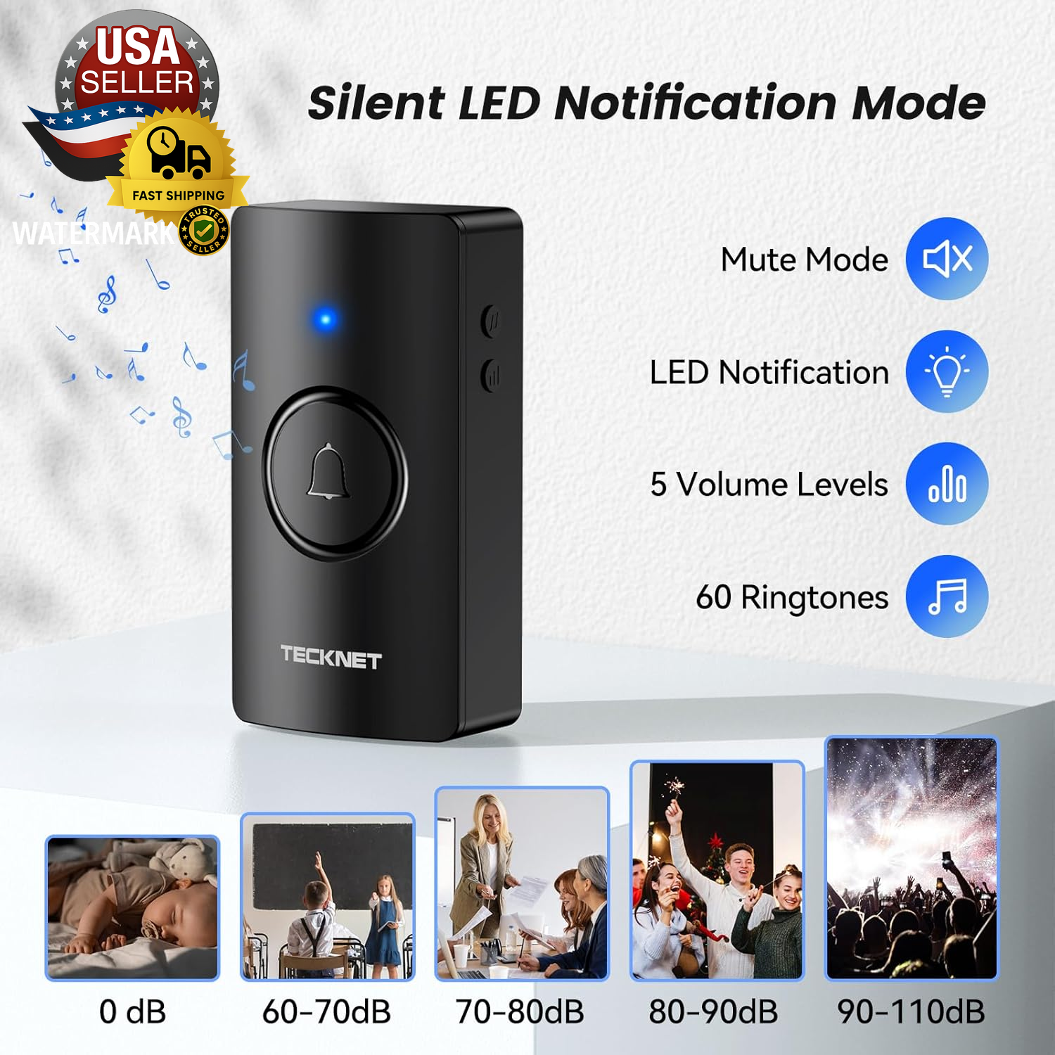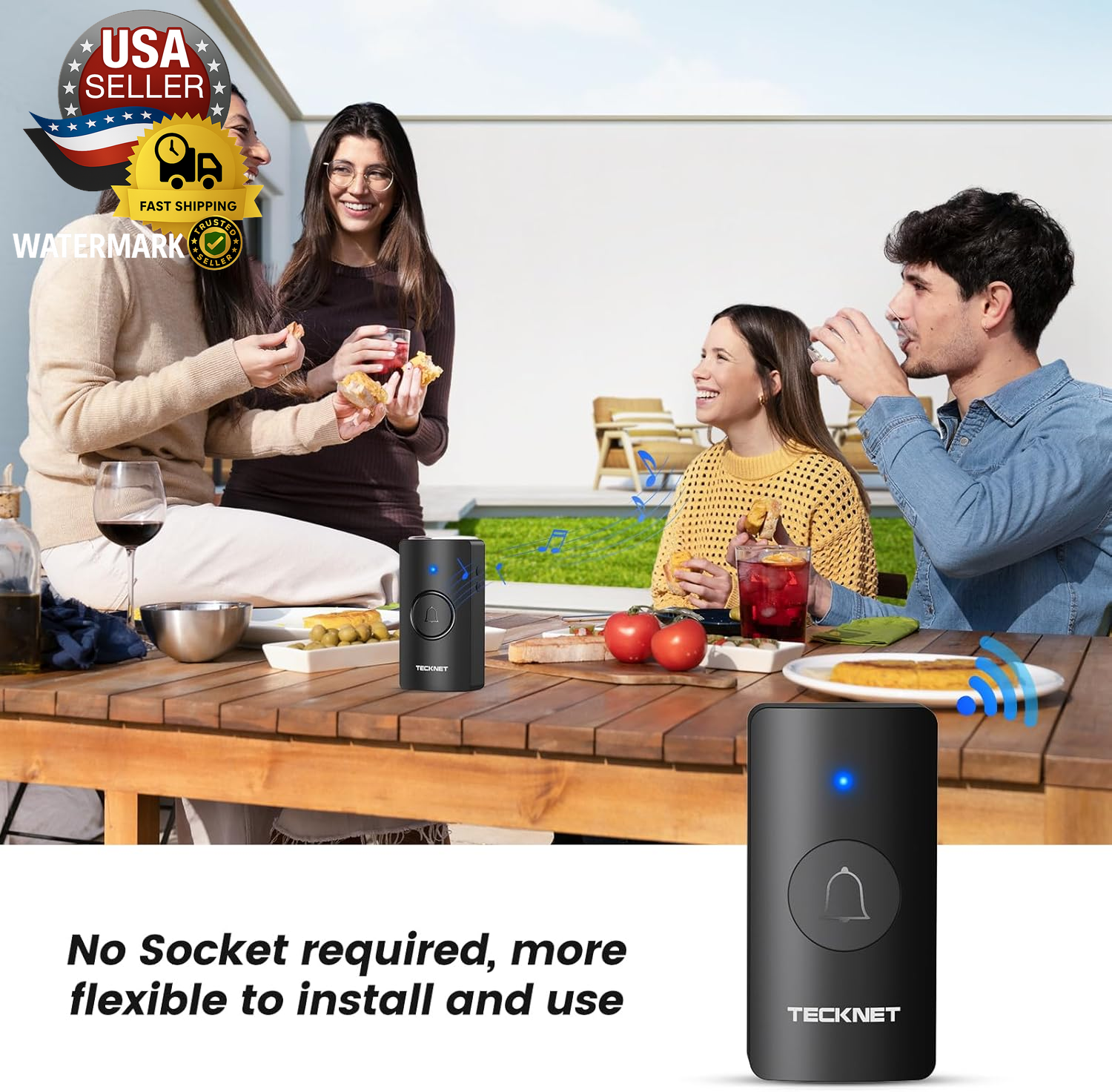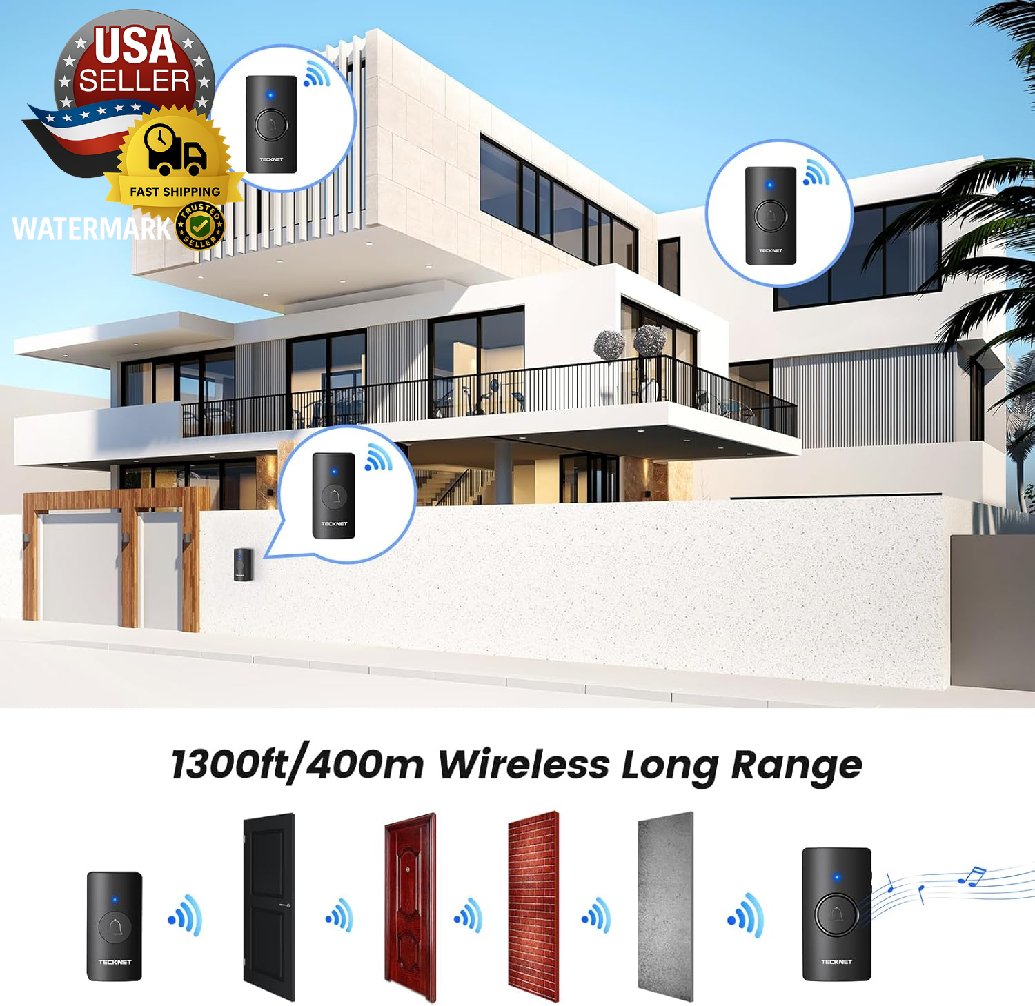 Wireless Doorbell, Battery-Powered Door Bell Ringer with 1400Ft Range, 60 Chimes & Customizable Door Chime, 5 Volume Levels, IP65 Waterproof – No Plug-In Required, Perfect for Home Use ✅【Battery-Powered Wireless Doorbell】TECKNET wireless doorbell is battery-powered, offering a convenient and portable solution without the need for an electrical outlet. This easy-to-install doorbell allows you to place it anywhere in your home, office, or classroom, providing hassle-free use with no complicated wiring involved. ✅【Wireless Doorbell with Long Range】With a remarkable 1400ft range, this wireless doorbell ensures a strong and reliable signal throughout your home, office, or classroom. Enjoy clear notifications even in large spaces, with no worries about signal loss. ✅【60 Chimes & 5 Volume Levels】Customize your doorbell with 60 different chimes and 5 adjustable volume levels. Whether you want a subtle sound or a louder notification, this TECKNET battery-powered doorbell provides a sound that fits your environment perfectly. ✅【IP65 Weatherproof & Durable】Built to withstand the elements, this doorbell features an IP65 waterproof rating, making it ideal for outdoor use. It’s designed to perform perfectly even in rain or snow, ensuring long-lasting reliability. ✅【Wireless Doorbell With Memory】This smart wireless doorbell is an ideal door bell wireless solution for homes and classrooms, featuring three modes: LED flashing only, doorbell chime only, or both. This battery operated doorbell and wireless door bell automatically remembers your volume, melody, and mode even after power loss. Its easy setup and memory function make it a top choice for any room doorbell, door chime, or door bell chime need. ✅【Customizable Personalized Ringtones】Stand out with your unique ringtone! TECKNET doorbell allows you to personalize the chime, so you can choose your favorite sound or even upload your own. Perfect for homes, offices, and classrooms. Product Description Socket-free Battery-operated Doorbell With Receiver IP65 Waterproof Memory Function Doorbell retains last ringtone after power off/disconnect 1 400M Wireless Range 2 IP65 Waterproof Rating 3 5 Volume Levels 4 Memory Function Extended Battery Life With a single battery replacement, the doorbell boasts an extended battery life of 4.5 years, showcasing exceptional longevity. Accessible Tranquility The doorbell includes LED lights for the hearing-impaired and offers a silent mode to prevent disturbances. How do I pair the doorbell button with the receiver? 1. Hold the music button for 3 seconds until the "dingdong" prompt indicates pairing mode. 2. Press the button once; the default chime confirms successful pairing. How do I clear the pairing record? Press and hold the Volume Button for over 5 seconds, and you'll hear a "dingdong,ding dong" prompt showing that there ceiverhas cleared all pairing records. (This will remove all paired Push Buttons.) What kind of batteries do doorbells need? The transmitter contains 1* CR2023 battery, and the receiver requires 3*AA batteries (Not Included) Why does the receiver's LED light stay on? The receiver's LED light stays on, which means the battery is low. Please replace the battery. Will weather affect performance? The product says IP65. Our IP65 rating ensures complete protection against dust and water jets. Safely install outdoors - it withstands rain, snow, and temperatures from -4°F to 140°F. Item model number HWD01990 Batteries Required? Yes Size 1Transmitter+1 Receiver Power Source Battery Powered Color Black Product Dimensions 4.53 x 2.48 x 2.13 inches Item Weight 4.2 ounces Batteries Included? No Included Components 1x wireless doorbell Brand Unbranded Shipping Fast shipping is vital for us. Our standard US shipping service is FREE. International shipping depends on location; see the listing. Your order will be shipped within 2-3 business days upon full payment received. Your order will be delivered within 2-3 business days after the handling time. We offer free shipping to the lower 48 states and ship within 2-3 business days of payment, usually sooner. We do not accept P.O. Boxes. Please provide a physical address. We are not responsible for undeliverable addresses. Returns and payment We offer a 30-day return policy from the checkout date. Require immediate payment when the buyer uses Buy It Now. FeedBack Your feedback is essential to us. After you get your package and you are satisfied with our service, please leave us positive feedback. Positive feedback is appreciated and always returned automatically—thanks for supporting a trusted seller! If you have any problem with your order / any questions, please contact us before leaving any type of feedback. For any questions, use the eBay contact system Please visit our eBay store to check out other items for sale! Thank you for shopping at our store.