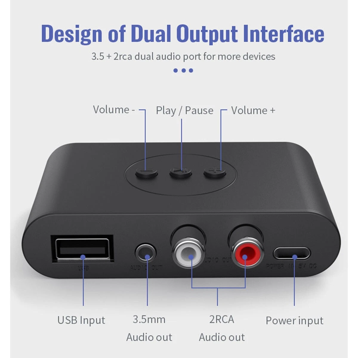 Features: 1.Auto On When you connect to the power, So its very good for to use in car or other you want it have auto on functions . 2.Dual Device Link: Simultaneously pair your smartphone and tablet and stream music from either one with any stereo system that supports a standard 3.5mm or RCA jack . Connect two Bluetooth devices at once to listen to music, make phone calls, and more. 3.Connect two devices: Support to connect with 3.5mm audio port and 2 RCA audio port at the same time. 4.Hands-free Calling & Navigation Broadcast: A built-in microphone for hands-free calls; One simple button to answer/redial/hang up/reject calls. Besides, the vikefon Bluetooth car adapter supports broadcasting voice notification from existed navigation App, you don't need to look down the phone to ensure safe driving. 5.Wireless Music Streaming: Stereo stream music to non-Bluetooth headphones and speakers. 6.Space-Saving Design: Ultra-compact and lightweight for convenient use with a variety of devices. 7.Super Stable Connection: Our Bluetooth audio adapter is fitted with a Bluetooth 5.0 chip for steady pairing, fast transmission and a wide signal range (33 feet). With the 3.5mm AUX port and 2 RCA port, it can be connected to non-Bluetooth car audio systems, home stereo, wired headphone/speaker, Amplifier/Home Theater.etc. Then you can enjoy wireless Hi-fi music streaming! Note: It's a vikefon Bluetooth receiver only, not a transmitter. So you couldn't use it for your TV, keyboard, mouse. 8.Auto-Connect:This Bluetooth receiver will automatically connect to the last paired Bluetooth device when you turn it on the next time. 9.3-KEY: Next song/Volume Up, Previous Song/Volume Down, Multifunction Button(MFB) 10: Upgraded to support U Disk play. 11.Note: No built in battery,So POWERED BY USB CHARGING. Package Content 1x Bluetooth 5.1 Audio Receiver Adapter 1x 3.5mm Aux Cable 1x User Manual 1x Type C Charge Cable
