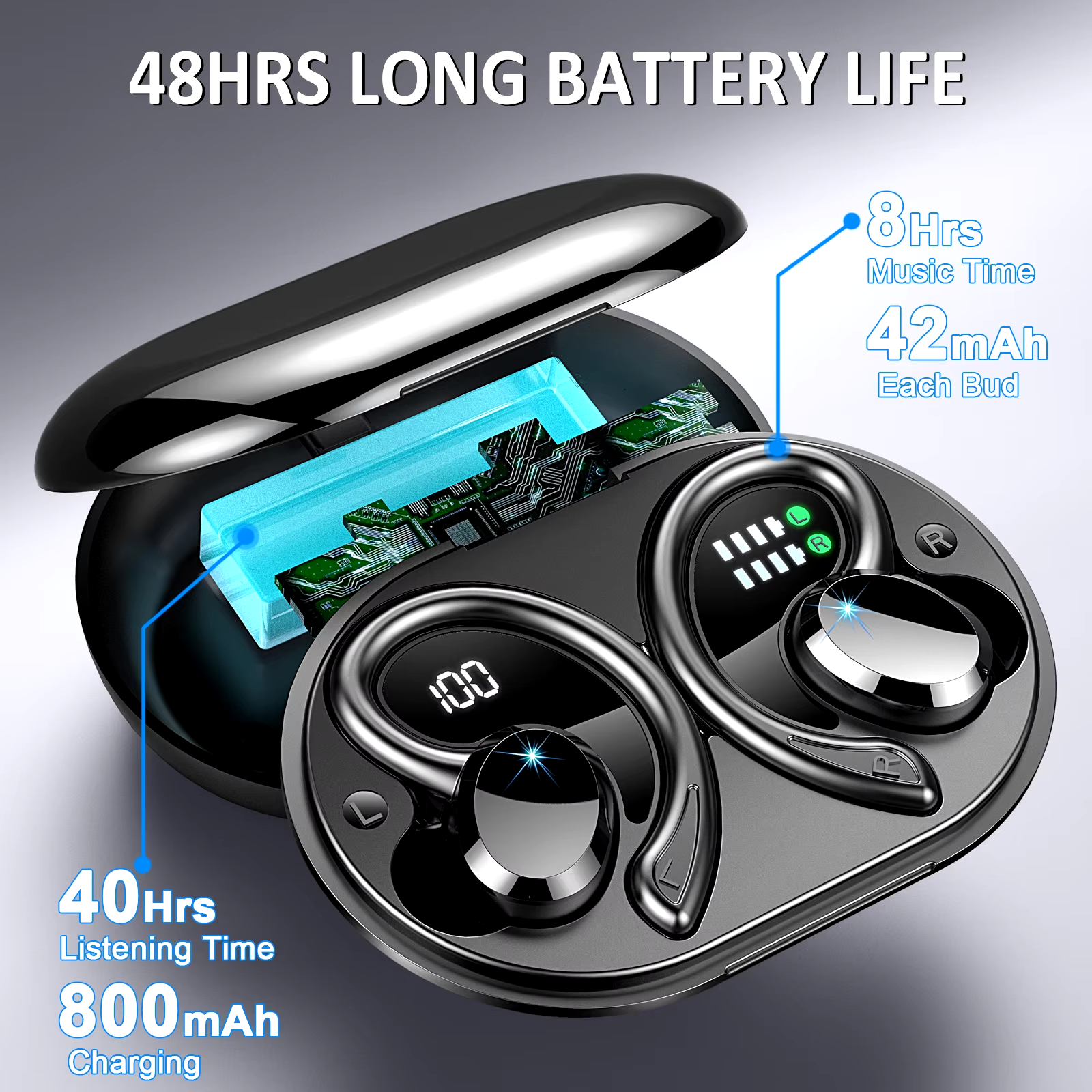 Bluetooth 5.3 Technology & Auto Pairing: Features Bluetooth 5.3 with dual-channel transmission for instant pairing and stable, uninterrupted connectivity. Earbuds automatically connect to the last paired device when taken out of the charging case. Ergonomic Comfort Sports Design: Includes soft ear hooks that fit the contours of your ears, ensuring comfort and a secure fit during strenuous activities. Comes with 3 pairs of different sizes of spare ear caps for a customized fit. IP7 waterproof rating protects against sweat and rain, making them ideal for sports, workouts, and running. Stereo Sound Quality & Clear Calls: Equipped with 14.2 mm vibrating diaphragms and AAC/SBC audio coding technology for strong bass and balanced mid and high frequencies. HD microphone in each earbud reduces background noise for clear, realistic calls. 48 Hours Ultra Long Playtime & Dual LED Display: Offers up to 8 hours of playtime on a single charge, extended to 48 hours with the portable charging case. Dual power display shows remaining battery of the case by number and charging status of earbuds by LED bar.