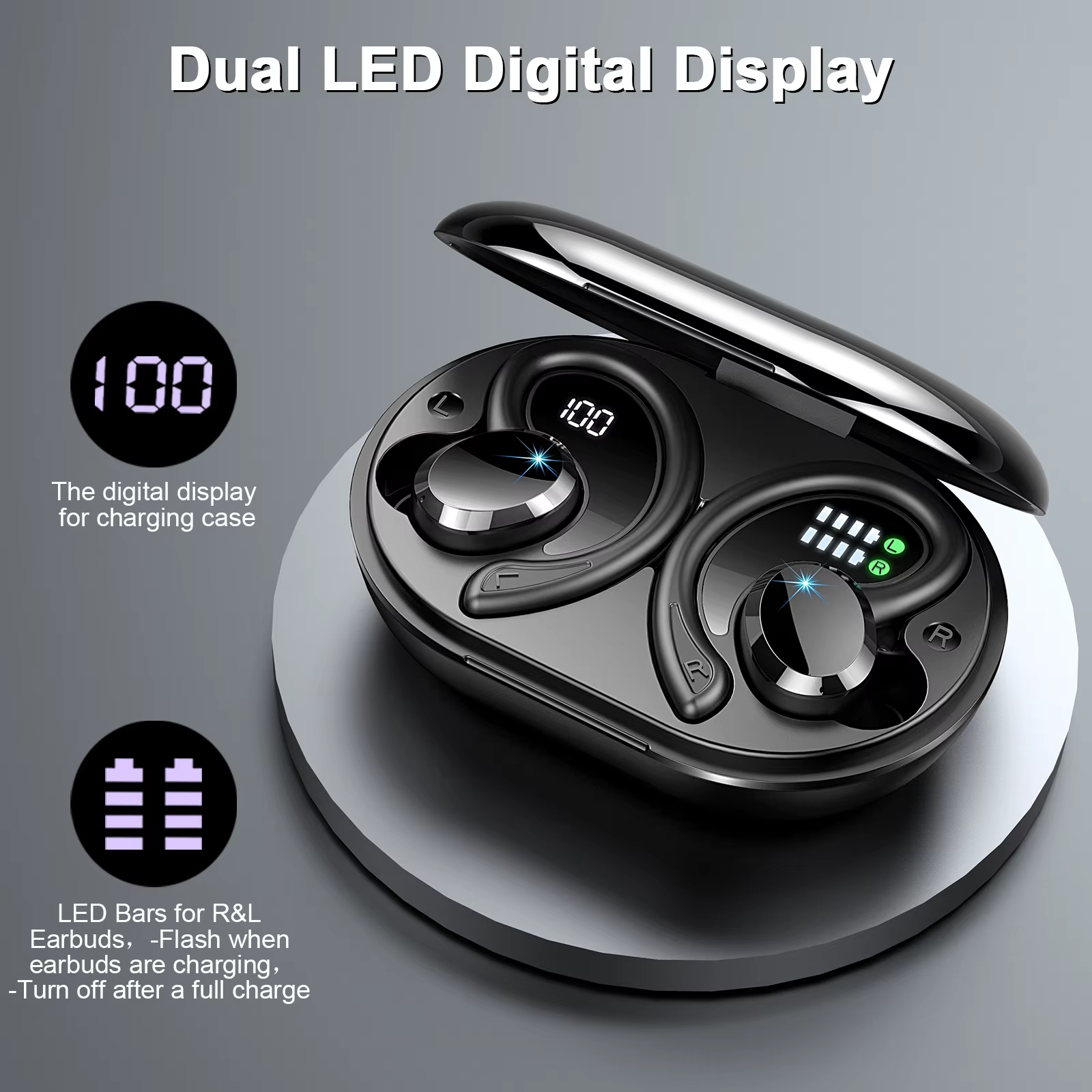 Bluetooth 5.3 Technology & Auto Pairing: Features Bluetooth 5.3 with dual-channel transmission for instant pairing and stable, uninterrupted connectivity. Earbuds automatically connect to the last paired device when taken out of the charging case. Ergonomic Comfort Sports Design: Includes soft ear hooks that fit the contours of your ears, ensuring comfort and a secure fit during strenuous activities. Comes with 3 pairs of different sizes of spare ear caps for a customized fit. IP7 waterproof rating protects against sweat and rain, making them ideal for sports, workouts, and running. Stereo Sound Quality & Clear Calls: Equipped with 14.2 mm vibrating diaphragms and AAC/SBC audio coding technology for strong bass and balanced mid and high frequencies. HD microphone in each earbud reduces background noise for clear, realistic calls. 48 Hours Ultra Long Playtime & Dual LED Display: Offers up to 8 hours of playtime on a single charge, extended to 48 hours with the portable charging case. Dual power display shows remaining battery of the case by number and charging status of earbuds by LED bar. Comfort & Durability Designed with a 45° earhook for a secure fit, and IP7 waterproof rating for protection against sweat and rain. Quick Charge & Long Playtime Enjoy 2 hours of playback after a 10-minute quick charge, and up to 48 hours with the 800mAh charging case. Enhanced Audio Quality Experience rich, layered sound with a 14.2mm diaphragm and AAC/SBC decoder, offering a 45% increase in audio frequency range (20Hz-20kHz). Smart Touch Control Intuitive touch controls for easy operation, and a sleek, glossy design for a refined look. Crystal Clear Calls Equipped with dual microphones and CVC 8.0 noise reduction, ensuring 80% sound retention for clear communication. Advanced Connectivity Bluetooth 5.3 technology with dual-channel transmission, offering 150% faster transmission and 50% more stability than Bluetooth 5.2, with 100ms low latency.