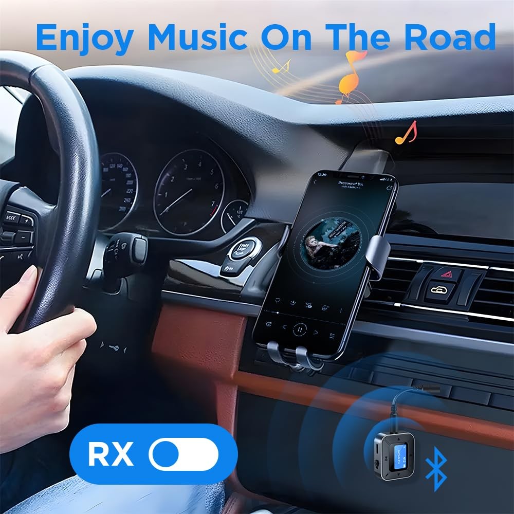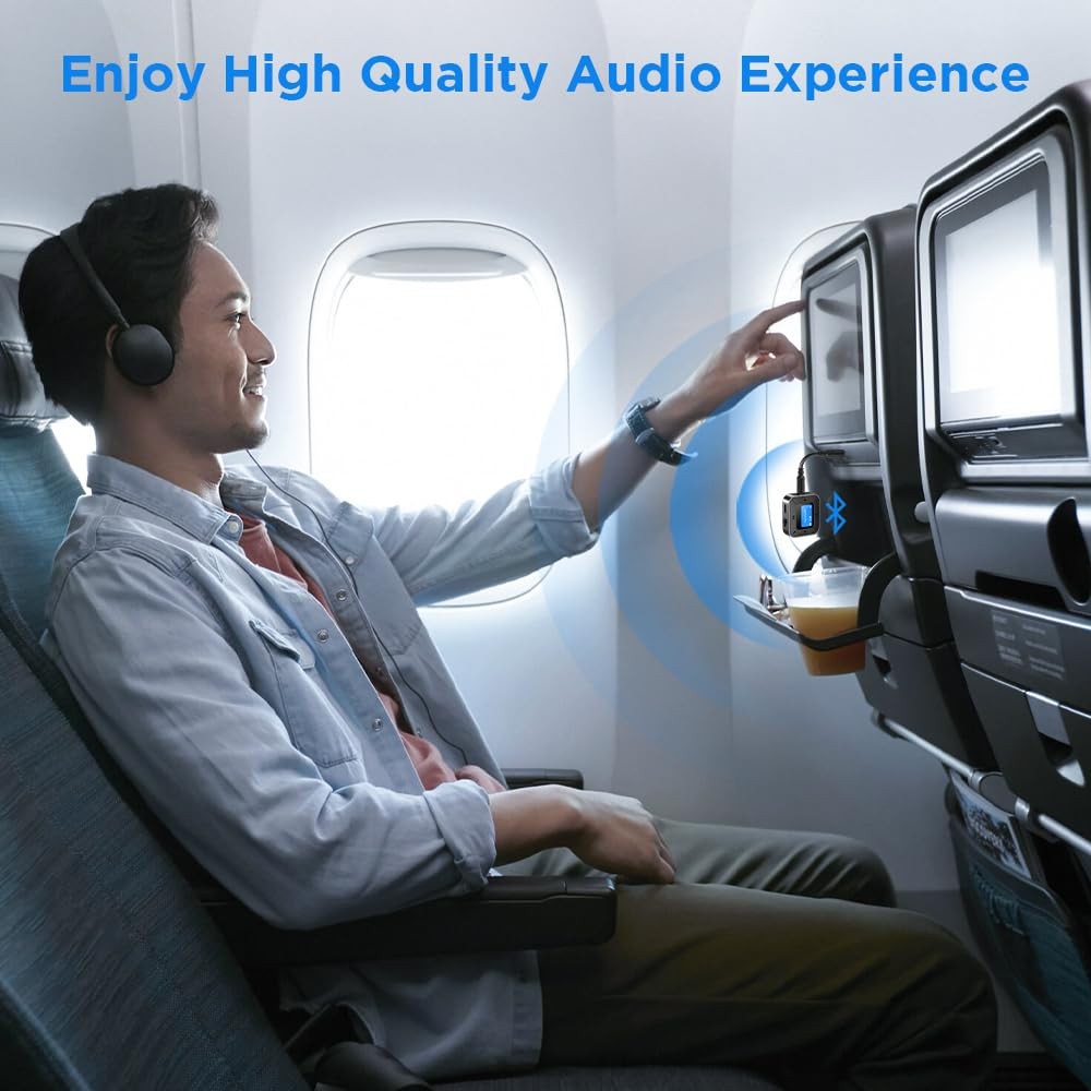 Product Description: Bluetooth Transmitter Receiver is a cool gadget to turn non-bluetooth device into bluetooth audio device. Tiny size, robust build quality, and good performance. This is an awesome thing to have. Crystal LCD Screen: Providing pairing devices and process, battery capacity, volume information and mode display, eliminates the guess when using. Long Rang Transmit: 50Ft/15M transmit allows you to use it in many multiple place. Built in Battery: Built-in battery design allows you to use it on airplane or other place without charging port. Hard Shell Case : Portable bag can protect your device and allows you to carry it more convenient. Product Specification: Size: 1.7×1.5×0.63 Inch Net Weight: 0.05lb Battery capacity: 3.7V 200mAh Bluetooth Version: 5.3 Battery Life (TX): 15 Hours Battery Life (RX): 11 Hours Charging Time: 1.5 Hours Standby Time: 6 Months Operation range: 50Ft/15M what's in the box? Bluetooth transmitter & receiver*1 3.5mm audio cable*1 Charging cable*1 Carrying case*1 Frequently Asked Questions: Q1: Can't connect the bluetooth transmitter to your bluetooth headphones or speakers? A1:Turn off bluetooth on the device you were previously paired, and keep the devices close to each other. Q2:Connected but no sound? A2:Try reconnect the bluetooth transmitter to the bluetooth device. Q3: There is a delay (latency) when using? A3: Ensure that your device supports low latency and keep the devices near each other with minimal obstructions. Note: 1.For initial pairing, maintain a distance of within 1 meter. 2.The following functions work only in RX mode: Previous/next song select on Microphone function 2-in-1 Bluetooth Transmitter & Receiver: In transmitter mode, the bluetooth adapter for airplane enables you to transmit audio from airplane, TVs, PCs, entertainment systems to Bluetooth headphones, Airpods and Bluetooth speakers. In receiver mode, the Bluetooth receiver connect your smartphone, tablets or computers to non bluetooth speakers, car stereos, or home stereos Pair With 2 Devices Simultaneously: In transmitter mode, the bluetooth adapter can connect two Airpods, Bluetooth headphones, or Bluetooth speakers simultaneously Long Battery Life: This bluetooth transmitter for airplane has a battery life of 15 hours to cover even the longest flight. It can be fully charged within 1.5 hours. Also this bluetooth airplane adaptor can be played while charging Wireless Airplane Companion: With bluetooth 5.3 transmit, more stable and more faster, this airplane bluetooth adapter will bring you a wonderful audio flying experience; Potable design of this bluetooth headphone adapter, you can carry this bluetooth plane adapter everywhere Easy To Use, Just Plug&Play: With intuitive LCD display, the bluetooth transmitter for headphones will bring you better using experience; With the memory function, it will automatically re-connect the last paired device