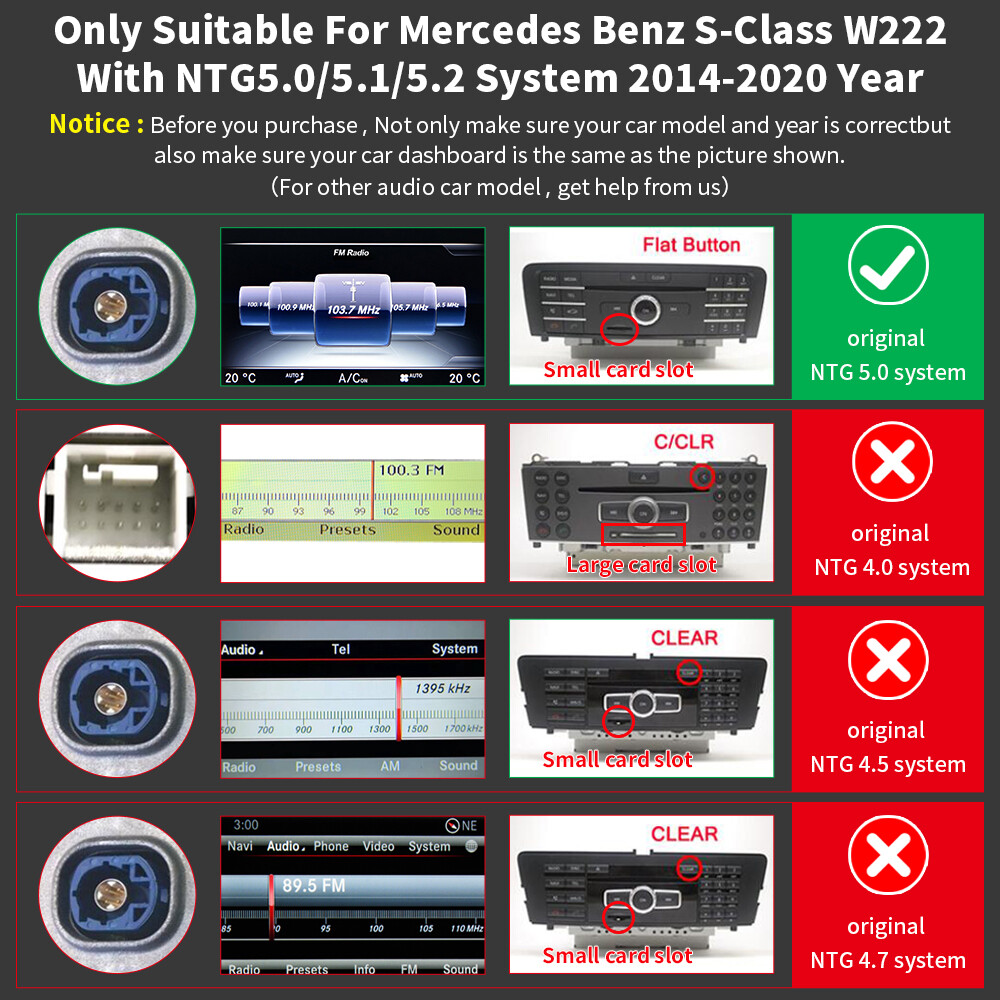 Wireless CarPlay for Mercedes Benz E-Class W217 S W222 2014-2018 vs Android Auto Wireless Apple CarPlay & Android Interface Package included: 1 x Road Top Carplay module(no included screen) All wires Detailed Instruction 1 x Beautiful box(can as a gift) Install help Compatible With Mercedes Benz NTG5.0/5.1/5.2 System Mercedes Benz C GLC CLA GLA Car Fit for Mercedes Benz C GLC Class W205 2015-2018 Year Car with NTG5.0/5.1/5.2 system C Class:C180 C200 C250 C300 C350E C43 AMG C45 AMG C63 AMG C63 AMG S 2015-2018 year GLC Class:GLC250 GLC300 GLC350e GLC43 AMG GLC63 AMG 2015-2018 year Fit for Mercedes Benz GLA Class CLA Class X156 C117 2015-2018 Year Car with NTG5.0/5.1/5.2 system CLA Class:CLA200 CLA250 CLA 45 AMG 2015-2018 year GLA Class:GLA200 GLA250 GLA45 AMG 2015-2018 year Pre-shopping Notes: When you buy, please check our website picture to make sure your car system is right. This Wireless Carplay Fits for Mercedes Benz GLA CLA C GLC Class X156 C117 W205 2015-2018 NTG5.0,NTG5.1,NTG5.2 left and right hand driver Car. Original car wire plug and play, no cutting wire, no breaking wire. Don't need to remove the factory screen, and make your car more smart. Wireless/Wired Apple Carplay: It can work with Siri/ Maps/ Music/ Phone Call. Built-in mic for Siri function and Bluetooth call , use Maps(Support Google Waze and sygic map, etc), listen to your favorite songs using iTunes, Apple Music or other app and access to messages. Keep your original car knob and steering wheel control. Wireless/Wired Android Auto: Use wireless or wired connection (USB cable) to enter the Android Auto system, Get real-time alerts on Google Maps and Waze. Make calls, check your messages, reply back, and use your favorite music apps, all while driving on road. Camera & Mirror Link Function: Support factory original reverse camera, parking radar;Support aftermarket reverse camera and 360 camera; Support front view camera DVR(CVBS input). When you put in the reverse, the camera will work automatically.Airplay(for iPhone)&AutoLink(for Android),Support Watch YouTube, TV news, Photos, Navigation and HD Videos. 1 Year Warranty & Install Help: Don't hurt your original car wires. Not affect your factory car warranty.If you don't have the confidence to install it, plz find a specialist to help out.Any issue please get help from us, We are more professional than auto repair shop.Please do not finalize install until you have tested every function on your car. Add smarter carplay function, enjoy your driving life. Function: Google Assistant Navigation Call Media Message Audio Book Made for the Way You Drive. F&Q About Android Auto 1.Q:Does it support wireless connection way? A:Whether it supports wired connection or wireless connection, this depends on your mobile phone type, you can know from android website. 2.Q:Which apps can I use on Android Auto? A:Android Auto makes it easy to access your favorite music, media, and messaging apps in the car.Check out all the Apps for Android website COMMON QUESTIONS 1. Will I have to change my original car screen or make wiring modifications? This kit allows retain the factory fitted display screen in your car; Needn't cutting wires etc. 2. Will sound come out of my benz radio? Yes, this kit allows music playback,and all sounds to be emitted through the car speakers; Simply switch the benz radio to ‘AUX’ channel mode for playback. (So before you buy, please make sure your original radio has aux option) Payment Delivery details Return Policy Feedback Contact us Payment Payment must be received within 7 Days from the date of purchase. Please leave note( your car model and years and original vehicle system )in order details when making the payment . Orders will be processed instantly and dispatched within 48 hours normally. Any qiestions or not sure information,please contact us before or after you place orders. Delivery details We only ship to ebay address! If you want to ship to other address, please change your ebay address before making a payment. We Ship to Worldwide, except China and so on. Items will be shipped within 1-5 business days on payment received. Your order will be expedited to your address via DHL/FedEx/TNT/UPS etc, reach most of the countries within 5-14 business days,or even faster. Delivery time depends on destination and other factors, it may take up to 10 business days. If you don't receive the item after 15 days, please contact us, we'll investigate and solve the delivery problem. Customs duty is obligation and liability of a citizen in your country, so buyer should be responsible for any tax and custom duty incurred. Generally, the delay or failure delivery is sometimes caused by the policy of different customs. For example, Laser Pointer is unacceptable in some countries. Therefore, please double check your local customs policy carefully before purchase. Or, we will NOT be responsible for any failure delivery related destination customs issue. Return Policy Defective product must tell us within 5 days attached with the picture of defective part. Please return it with your own cost within 2 weeks from the time the merchandise is received. We will arrange to exchange a new one for you at once. (you should include all original items undamaged in resalable condition, thanks). If you need refund, only item's listing price is refundable. Buyer is responsible for shipping cost incurred shipping products back. Buyers have to pay for the return cost and we will pay the cost for resend. If you are happy with the item or have any problem,please feel free to contact us and we will resolve your problem, please Don't leave us the negative feedback without send the message, thanks for your support. Feedback If you are satisfied, we sincerely hope that you can leave us a positive feedback and 5-star Detailed Seller Ratings, which are of vital importance to the growth of our company. Besides, PLEASE DO NOT leave us 1, 2, 3 or 4-star Detailed Seller Ratings because they are EQUAL T