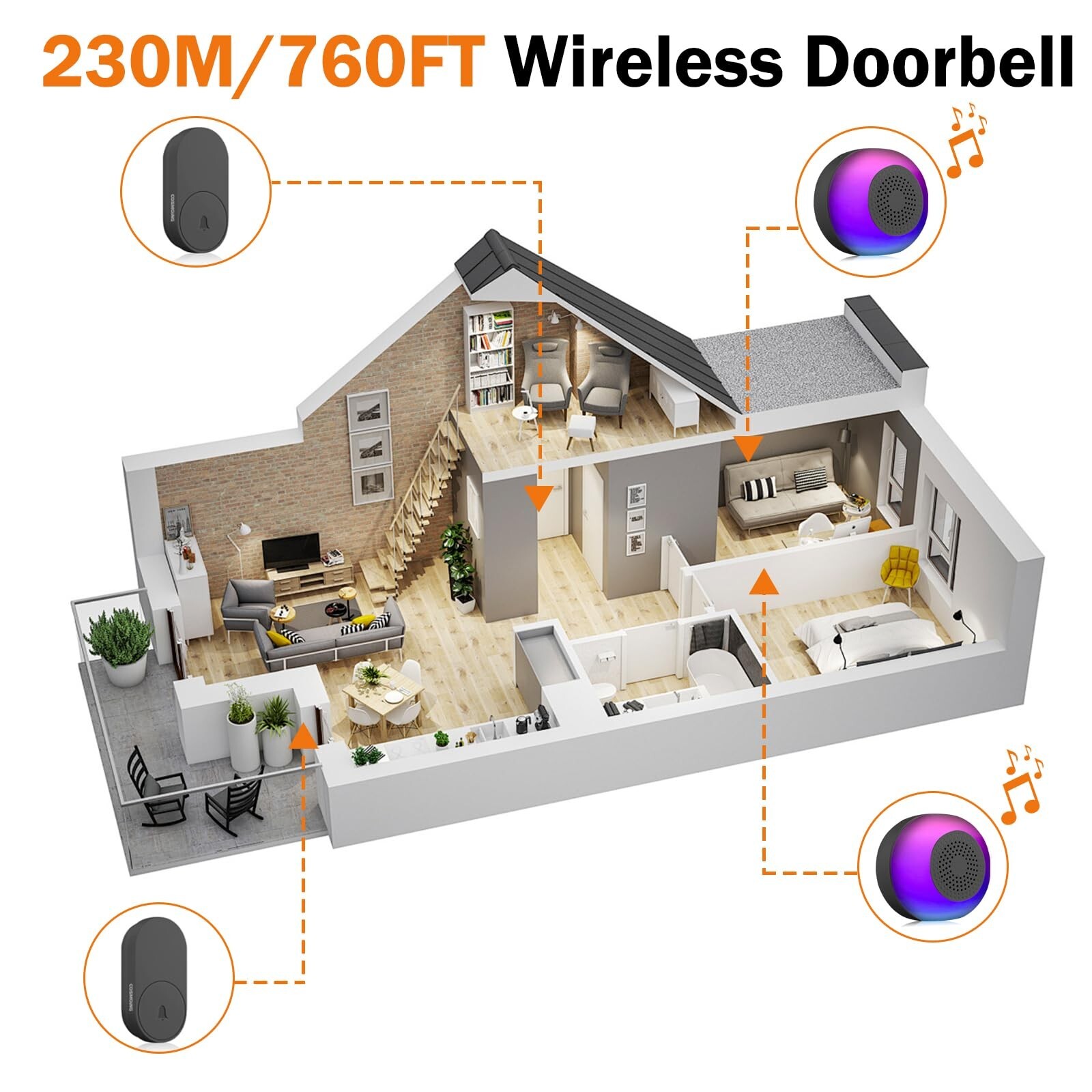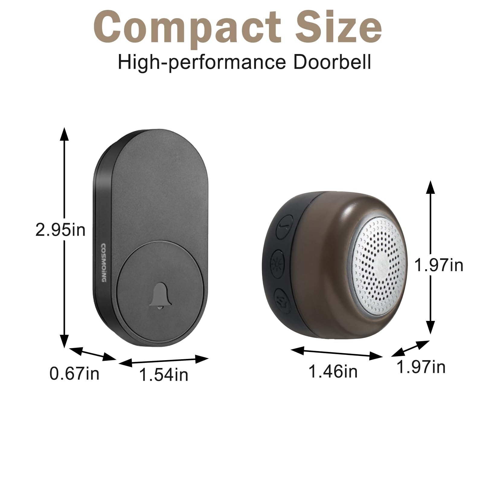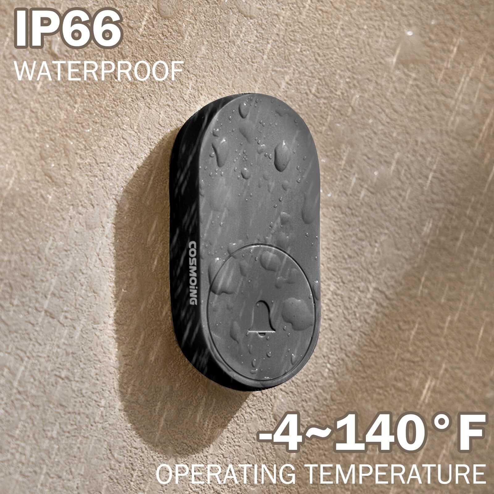 Wireless Doorbell IP66 Waterproof 59 Chimes 760 Feet 115dB with Volume Levels Mute Mode & 6 LED Flash Doorbell Ringer Wireless for Kids Bedroom Home Classroom Apartment Hearing-Impaired Product Details Size: 1 Receiver 1 Push button Brand: COSMOING MPN: G-213-US UPC: 739240401178 EAN: 0739240401178 Manufacturer: COSMOING Part Number: G-213-US Item Weight: 3.52 ounces Package Dimensions: 4.25 x 3.27 x 2.24 inches Country of Origin: China Item model number: G-213-US Batteries: 1 CR123A batteries required. (included) Size: 1 Receiver 1 Push button Batteries Included?: Yes Batteries Required?: Yes Battery Cell Type: Lithium Manganese Dioxide Description Pile: CR2032 Date First Available: September 20, 2024 Long Wireless RangeThe wireless doorbell has been paired and can be installed in one minute, plug the receiver into the socket, and you are ready to use the sensing distance can reach up to 230M/760FT. Wireless doorbells suitable for home,apartment, classroom, villas, hotel, factory, hospital and more. 59 Chimes to Choose & Mute ModeThe wireless doorbells not only has 59 unique chimes and 5 adjustable volume levels(0dB to 115dB) to meet your needs for different occasions, but also has a mute mode to choose from so that you don't have to worry about the doorbell chime disturbing your sleeping baby. Even in mute mode, the receiver LED light still flashes and you will never miss a visitor. 5 Volume Levels & Memory FunctionThis door bell ringer wireless have 5 adjustabl volume levels. Up to 115 dB, even the hearing-impaired seniors can hear someone ringing the bell. The doorbell will remember and restore your previous melody and volume level the next time you work, no need to reset to your previous settings even after a power outage. IP66 Waterproof & Weather ResistanceThe wireless doorbel IP66 waterproof level is far ahead of the IP55 waterproof level on the market, the dustproof and waterproof rating is IP66(operating temperature between -4F and 140F), which can work in severe weather such as heavy rain, snowstorms or dust storms. Easy to Install Just plug the doorbell wireless receiver into a power outlet, then use the accessories provided to fasten the transmitter to the wall or anywhere you want. The covenient and easy to use design can give you a perfect user experience.