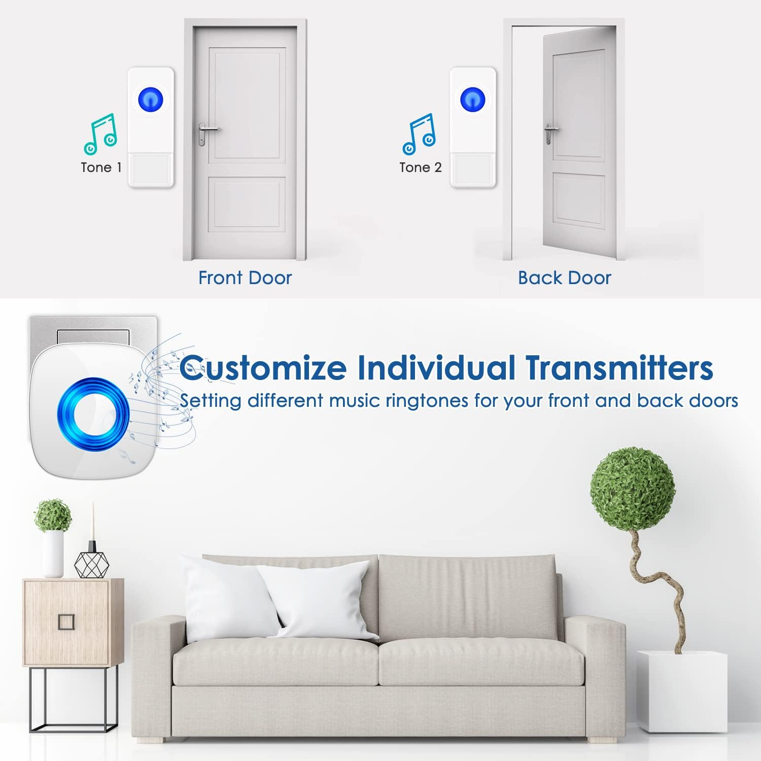 Long Wireless Range Doorbell System - Our wireless doorbells for home is adopt high-frequency electronic technology to control indoor chime. The range of houses wireless doorbell extend over 1300ft(400m) in open space. The door bell ringer wireless has strong anti-interference features and you can pair it one-to-one, and NO need to worry about signal connecting wrongly with the next door Waterproof Doorbell Buttons & Easy to Install - The door bells chimes wireless is made of high-quality ABS material, has strong IP55 waterproof function, working on -4°F to 140°F. Easy Installation: plug wireless doorbell receiver in the socket and adhere the transmitter to the wall via double-sided tape or Screws-in Multiple Optional Ringtone & Mute Mode - PHYSEN wireless door bell features 58 chimes and 5 level adjustable volume(0 dB to 110 dB) to meet your needs for different occasions. Bright LED flash is suitable for the elderly and hearing impaired. The best door chimes can remembers your last melody and volume level after closing it. No need to reset the previous settings, really save your time Expandable and Multi Use - PHYSEN door bell wireless set can add more plug-in receivers or doorbell transmitters as required, choose 1 button with 1 receiver or 2 buttons with 2 receivers or 2 buttons with 3 receiver sets, etc. Multiple bed room doorbell can be configured to ring with different ringtones for your front door and back door. You will never miss your visitor Wireless Doorbell Kits - Door Bell Kits contains: 2 remote transmitters and 3 smart doorbell receivers, double sided mounting tape, anchors, screws and A23 battery included. This doorbell wireless is great for large homes, apartments, offices & classroom, it can also be installed in your kid's bedroom to wake them up in the morning or notify them to come for dinner Product Description PHYSEN Waterproof Door bell Chime Kit Operating at 1300-ft Range Extend over 1300ft(400m) in open space Expandable doorbell system Can add more receivers or door bell ringer buttons as required 5 ADJUSTABLE VOLUME LEVELS 58 Chimes & Bright LED Indicator The doorbell receiver offers 58 melodies for you to choose. You can pair different ringtones for the front door and back door, so that you know which door is ringing. Waterproof Doorbell Button IP55 dustproof and waterproof protection. The doorbell push button will be functional between -4 °F to 140 °F, the push button tough enough to withstand almost any outdoor conditions. Memory Function Our PHYSEN doorbell wireless can remembers your last melody and volume level after a power outage. Caregiver Pager Loud enough doorbell rings, give you a visual form of notification(an excellent feature for the hearing impaired). PHSYEN Wireless Doorbells for Home Security System Add to Cart Add to Cart Customer Reviews 4.5 out of 5 stars 1,604 4.5 out of 5 stars 1,604 4.5 out of 5 stars 1,604 4.5 out of 5 stars 1,604 Price $39.99 $ 39 . 99 $25.99 $ 25 . 99 $36.99 $ 36 . 99 $49.99 $ 49 . 99 Wireless Range 1,300 ft 1,300 ft 1,300 ft 1,300 ft Ring Tones 58 58 58 58 Receiver Plug-in Plug-in Plug-in Plug-in Push Button Battery Operated Battery Operated Battery Operated Battery Operated Battery Type 12V Alkaline 12V Alkaline 12V Alkaline 12V Alkaline Expandable ✔ ✔ ✔ ✔ Waterproof ✔ ✔ ✔ ✔