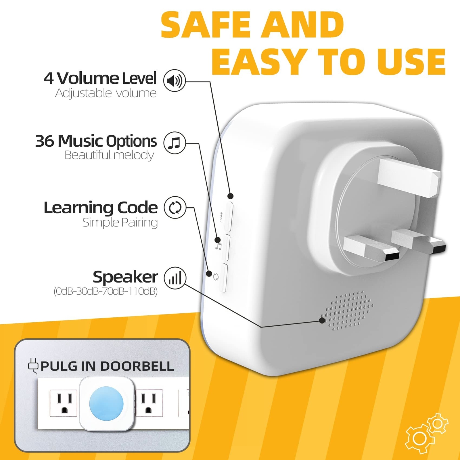 Wireless Doorbell 1200Ft Door Bells for Home with Flashing Light Hearing Impaired Door bell 1 Battery Button & 3 Plug in Receivers for Home Classroom Room Office Product Details Color: 1 Button & 3 Receivers Brand: Jsieem MPN: D157-1T3 3.0 UPC: Does not apply EAN: Does not apply Manufacturer: Jsieem Item Weight: 14 ounces Product Dimensions: 7.2 x 3.89 x 3.6 inches Country of Origin: China Item model number: D157-1T3 3.0 Batteries: 1 CR2032 batteries required. (included) Color: 1 Button & 3 Receivers Included Components: 1x button, 1x mounting accessories, 1x user manual, 3x receivers Batteries Included?: Yes Batteries Required?: Yes Battery Cell Type: Lithium Ion Date First Available: May 23, 2024 1 Doorbell Button & 3 ReceiversThis waterproof and dustproof wireless door bell button has higher sensitivity and lower energy consumption, and it will light up when activated,and 3 receivers can be placed at living room,bedroom,kitchen and so on. Deaf Doorbell Flashing Light The hearing impaired doorbell has 3 modes, Ringing only - flashing only - flashing when ringing.You can freely switch modes as needed with a simple one-button switch. 36 Chimes & 4 Volume Level The wireless doorbells for home have 36 melodies, 4 volume levels (silent - low - middle - high).The 3 receivers can be set with different ringtones and volumes, and can be used as a silent doorbell. Long Working Range up to 1200 Feet-The signal of the indoor flashing door bell can be up to 1200 feet in an open area and won't interfere with other devices in your home or neighbors, and the cordless doorbell button provides IP44 waterproof. This will be the practical doorbell wireless for home you'll ever see. Easy to InstallIt would be very easy to install the wireless door bell,just plug in the doorbell to the socket, remove the insulating piece in the doorbell button, and install it to the door frame with the mounting accessories it comes with.