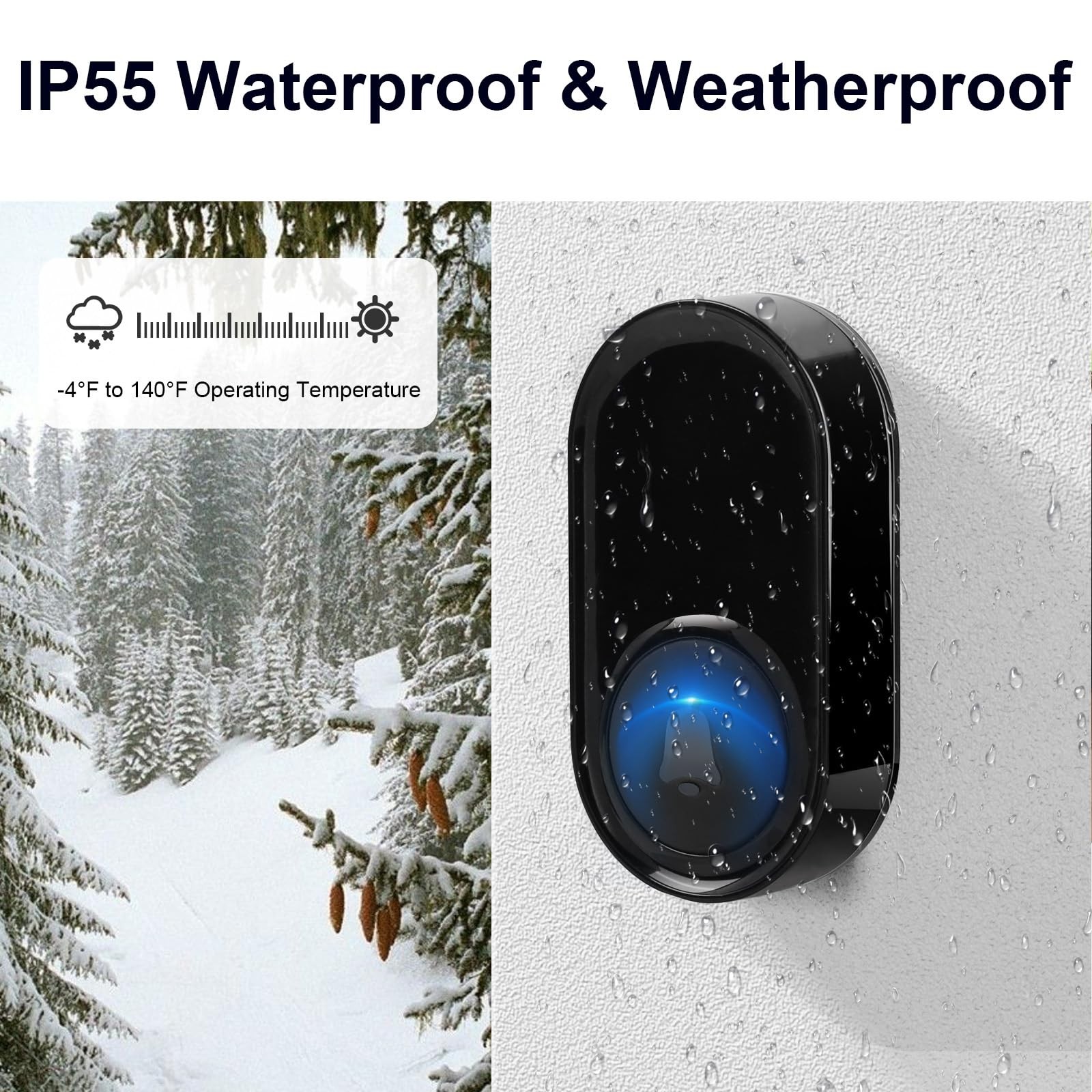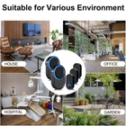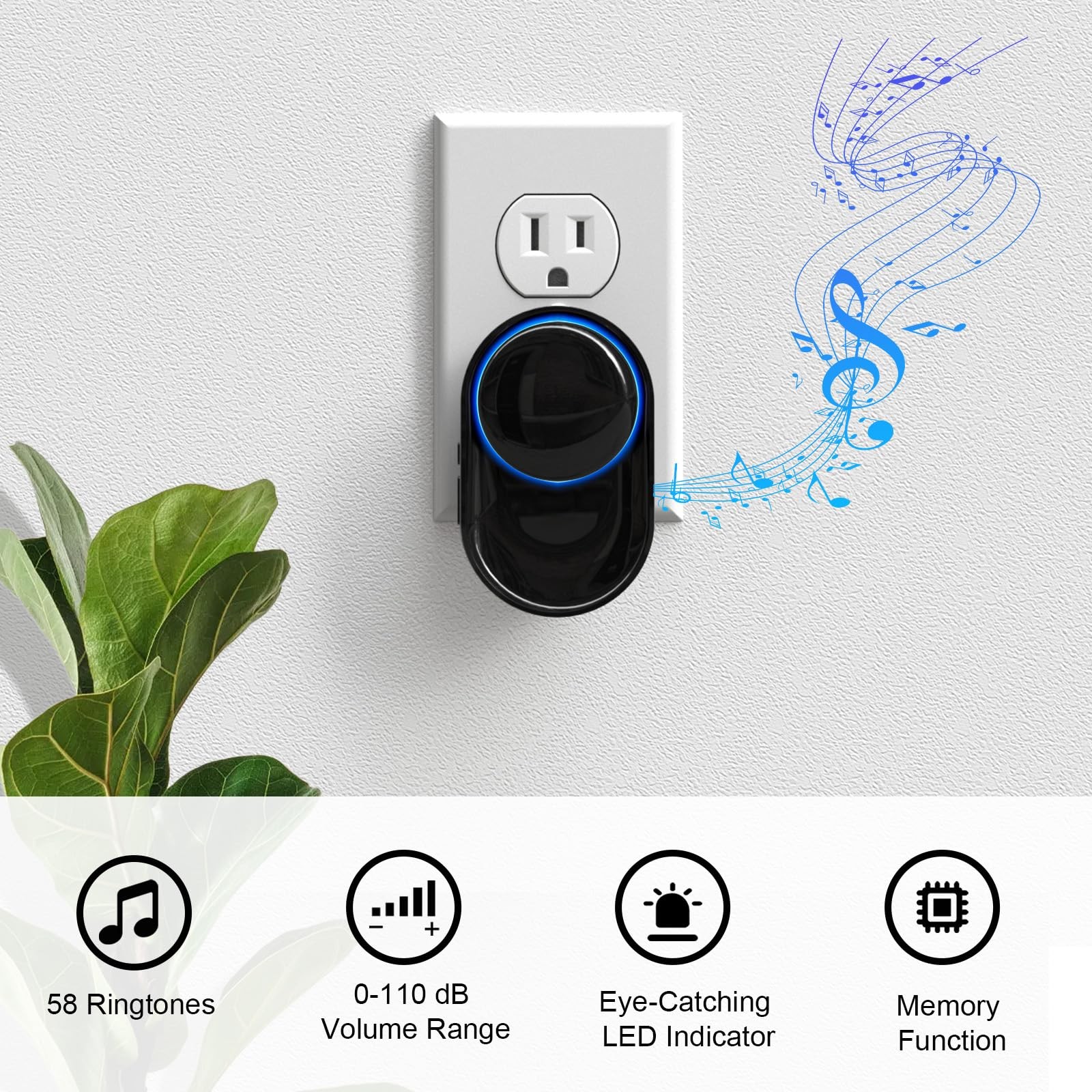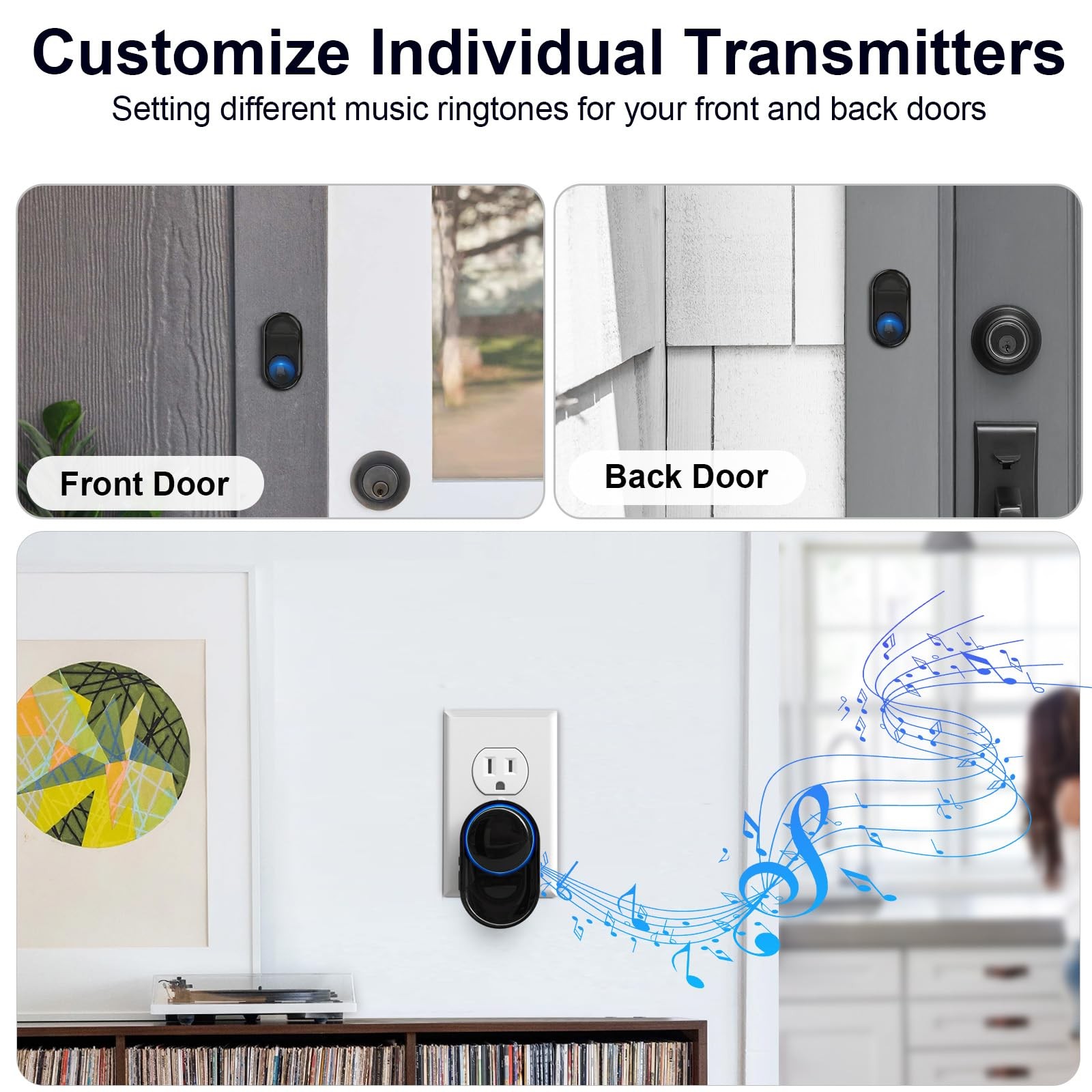 Long Wireless Range - The range of wireless door bells for homes extend over 1300ft(400m) in open space. The door bell wireless set is great for large homes, apartments, offices & classroom. You’ll never miss a chime 58 Ringtones & Mute Mode - wireless door bell features 58 chimes and 5 level adjustable volume(0 dB to 110 dB) to meet your needs for different occasions. LED flash are suitable for the elderly and hearing impaired. The best wireless door bell chime can remembers your last melody and volume level after closing it; No need to reset the previous settings, really save your time Long Wireless Range - The range of wireless door bells for homes extend over 1300ft(400m) in open space. The door bell wireless set is great for large homes, apartments, offices & classroom. You’ll never miss a chime Waterproof Push Button & Easy to Install - Wireless doorbell chime is truly waterproof & weatherproof to -4°F/140°F. Installing and pairing according to the instructions, NO tools needed! All you had to do was plug doorbell receiver into an outlet and adhere the remote transmitter to the wall via Double-sided tape or Screws-in Expandable and Multi Use - Wireless doorbell system can add more plug-in receivers or push buttons for increased coverage. Multiple battery operated doorbell can be configured to ring with different door chimes or ringtones to let you know where is the visitor Wireless Doorbell Kits - Door bell ringer wireless Contains: 3 wireless doorbell buttons and 1 smart doorbell receiver, double sided mounting tape, anchors, screws and A23 battery included