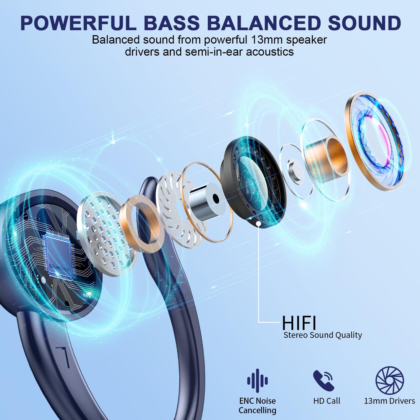 These wireless earbuds are a game-changer! The Bluetooth 5.3 connection is super stable with zero lag, perfect for workouts or calls. The noise cancellation and deep bass make music sound incredible, while the 50-hour battery life and IP7 waterproofing keep up with my active lifestyle. The earhooks stay secure during intense runs, and the auto-connect feature is so convenient. The LED display is a nice touch for checking battery levels. Definitely worth every penny for crystal-clear sound and all-day comfort!