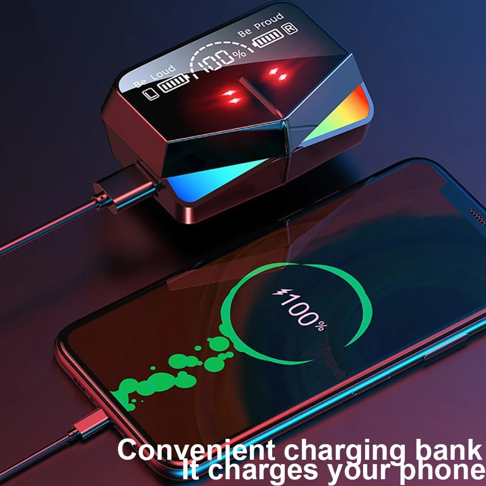Bluetooth 5.3&Excellent Stereo Sound Quality: The wireless Bluetooth earphones feature a brand new Bluetooth 5.3 chip, providing a brand new way to experience music, movies, podcasts, calls, and more. The earphones have a large speaker driver that provides truly authentic sound and powerful bass performance, with a driving area 1.9 times larger than the normal driving area. Dual mode dual independent headphones: can change game or music modes, providing you with more choices. Create an immersive music and audio-visual feast, suitable for any occasion. It has a low latency of 65ms, ensuring sound and image synchronization and enhancing the gaming experience. Independent dual host, independently connected to headphones. Both sides are equipped with intelligent dual-mode processing chips, which are the main headphones that can be disassembled and listened to. Comfortable to Wear & Cool Earphone Charging Case: Earphone ergonomic design, easy to wear for a long time comfortable, earphone is also designed with dazzling LED lights to highlight the game atmosphere, each ear contact surface is made of soft silicone, can help you get the best wearing effect, cool earphone charging case made of reflective material, when you need it can also be used as a mirror when you need it. High-Capacity Charging Case/reverse Charging: The wireless headphones are protected by a high-quality charging case and look stylish. A separate LED display on the phone case helps check the power level of the L/R earbuds and charging case at all times. The wireless Bluetooth headset provides 4-5 hours of listening time and 4 hours of talk time on a single charge, and provides a total of 24-30 hours of playback time using the oversized charging case/reverse charging. You can also reverse charge your phone when needed. IPX7 Waterproof Sports Earphone: The earphone adopts IPX7 waterproof design to protect the earphone from sweat and rain, and it will be firmly locked in your ear and not easy to fall off during exercise. It is suitable for fitness, running, camping, climbing, cycling and many other sports. Perfect for holiday gifts. How to use 1. Take the earphone out of the charging slot, and the earphone will automatically turn on. At this time, the headphone indicator flashes red and blue alternately, and it is in the pairing state. 2. Enable Bluetooth Settings for the device to be paired, and search for the Bluetooth name to pair and connect the device. Feature representation Rich immersive audio performance: Enhance your games and music sessions. At the same time, it provides all-round stereo and panoramic sound through dual-mode dual-decoded high-resolution audio, and the gameplay can be heard. Meet different needs, give you more choices. Create an immersive audio-visual feast of games and suitable for any occasion Immersive audio with Enhanced bass: A true wireless headset with enhanced bass stereo, powered by a large audio driver, delivers an immersive gaming experience. Hearing the subtle and high-energy parts of the game in a precisely positioned 3D soundscape can help you gain an edge. Wear fashionable and comfortable: TWS game headset, dazzling LED lights are designed on the headset to highlight the game atmosphere. It's easy to wear for a long time because every surface that touches your ear is made of soft silicone.Just enjoy your gaming moment! Touch, step pairing: the game headset multi-function touch, to achieve intuitive music control and call management, step pairing and push away technology, to ensure that the real wireless earbuds are easily set, after removing the shell automatically connected to a pairing device Up to 30 hours of game time: a single charge can play more than 6 hours, with a charging box can play more than 30 hours. Enjoy fast charging with a USB-C cable that fills the rechargeable case in just 1.5 hours. norm Product Type: Wireless earplugs Material :ABS Bluetooth version :V5.3 Frequency range :2.402GHz-2.480GHz Transmission distance: approximately 20 meters / 65.6 feet Built-in lithium battery: left and right earphones 50mAh, charging case 2000mah Package List 1 x Charging Cable 1 x Charging Compartment 1 Pair x Earphones