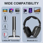 wireless TV headphones uses 2.4GHz millisecond response technology, which has stronger anti-interference, 30M/98 ft working range is three times that of traditional TV headphones (33ft); And it adds Bluetooth 5.3 function, making the bluetooth headphones for tv connection more stable and widely with TV, , ipad, laptops... Over-ear TV headphones has a personal volume design that allows you to adjust the headset to high volume even when the TV is muted, so you can enjoy own time without disturbing others. It comes with soft memory foam ear cups, retractable headband and lightweight design to accommodate different head sizes, making it ideal for extended use wireless headphones for TV Over-ear use provide a plug and play way that connect the transmitter dock to TV via the included cable (OPTICS/RCA/AUX), Just turn on the power and enjoy your TV show. It with an audio delay time < 40 milliseconds and a large 40mm sound unit, it gives you an immersive TV experience. Up to 10-15 hours of battery life allows you to watch TV or listen music for extended periods of time without needing to charge. When the battery needs to be charged, you can simply place the TV wireless headphones onto the transmitter charging dock, it will be fully charged automatically within 5 hours for next use. You will get 1*wireless headphones for tv, 1*RF transmitter(charging holder), 1*TYPE-C adaptor, 1*AUX audio cable, 1*audio RCA cable, 1*optical audio cable, 2*rechargeable battery, 1*user manual. team offer 24/7 , please us if you have any question, we will solve it for you in a timely manner.