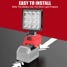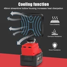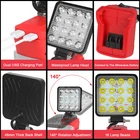 Product Description Designed for Milwaukee 18V Lithium-ion Batteries 48-11-1820 48-11-1822 48-11-1840 48-11-1850 48-11-1860 48-11-1862 and more. The portable work light is design with 16 LED beads. The angle of the cordless led work light head can be adjusted 140 degrees, ensuring optimal illumination in different directions. You're in safe with our low voltage protection feature. When your battery's voltage dips below 15V, the cordless led work light will shut off automatically, protecting against over-discharge and preserving your battery's health. The robust aluminum casing effectively dissipates heat. This cordless work light comes with two charging ports for your convenience. Simultaneously charge two devices with ease. The 5V 2A output is perfect for charging a variety of devices like smartphones, tablets, gaming consoles etc. Whether you're working on job sites, enjoying outdoor activities like camping and hiking, performing vehicle maintenance, or tackling DIY projects at home, this work light provides reliable illumination wherever you need it. Item Specification: Input voltage: 18 V Output voltage: 5 V, 2 A Power: 48 W LED lamp beads number: 16 Luminous flux: 4800 lm Color: Black and Red Package included: 1X P ortable Work Light