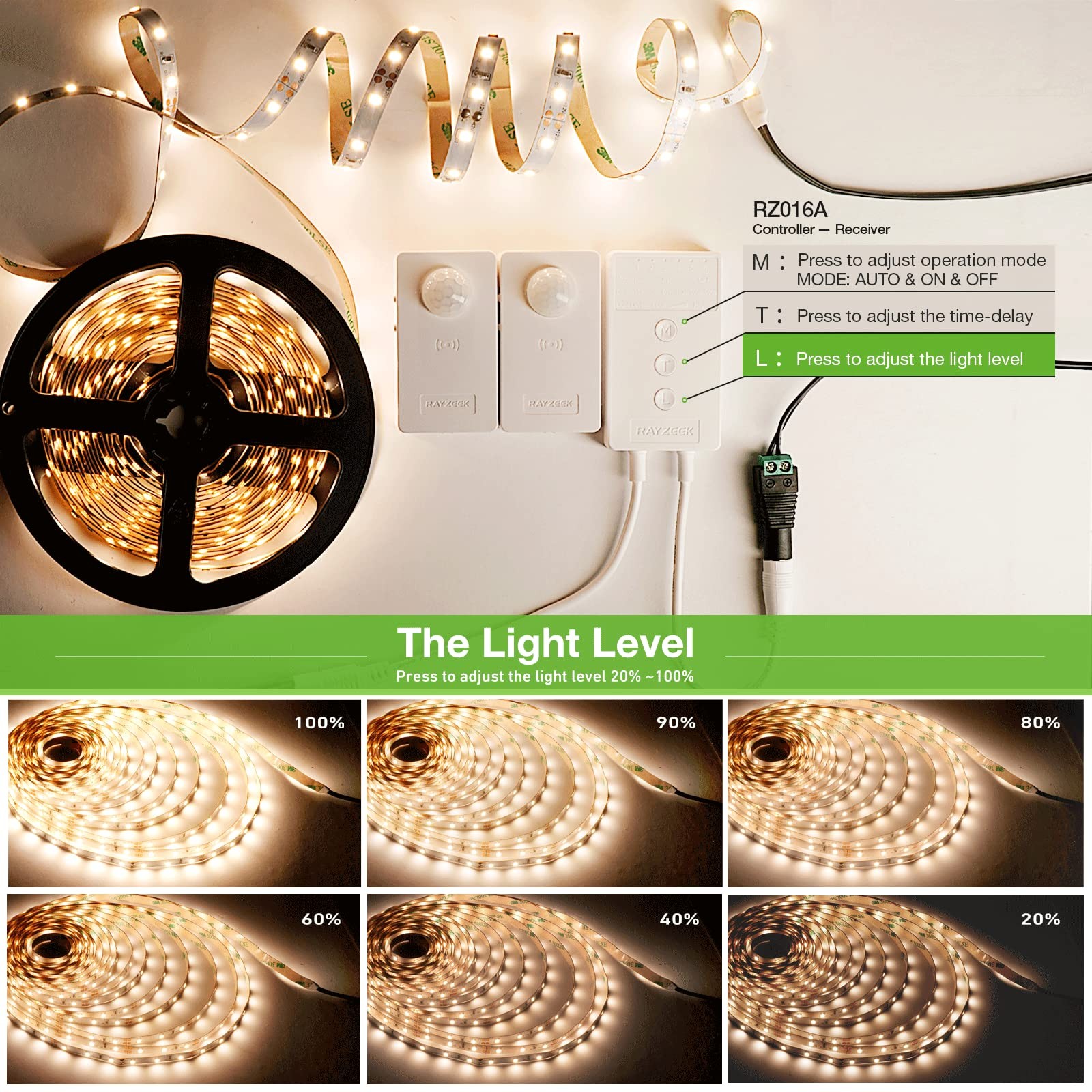 Wireless Motion Activated LED Strip Lights,19.7FT LED Strip Lights with Power Adapter,RF Wireless Motion Sensor Control Dimmer,Timing,Warm White (1×Controller+2×Motion Sensor) 【Wireless Motion Sensor】It only works with the controller and requires 2PCS AAA batteries. When it detects motion,it will give out a RF signal to the controller to turn on/off the load.Turn on the Light Sensor, and the sensor will only detect motion when the ambient brightness is lower than 35LUX to save energy 【Multi-function Controller】Auto/On/Off mode, Time-delay 15s-30s-60s-180s-300s-900s, Dimmable 20%-100%, the perfect design provides you with a variety of choices 【Cuttable/Expandable Strip Light】Wireless motion activated LED light strip with built-in 360 high-quality SMD2835 lamp beads/2520ml, 50000+ hours of long life. You can DIY cut it or extend it with the included 11.81-foot extension cord 【Reliable range and technology】The barrier-free detection range is 5-8 meters, and the wireless transmission range is 7-20 meters.The mature and reliable low-power wireless sensing technology brings more convenience to your life 【Safe to use, flexible application】Power Adapter runs on DC12V-24V, which is safe for children and the elderly. You can place the wireless sensor anywhere, it is very suitable for stairs, living room, kitchen, etc
