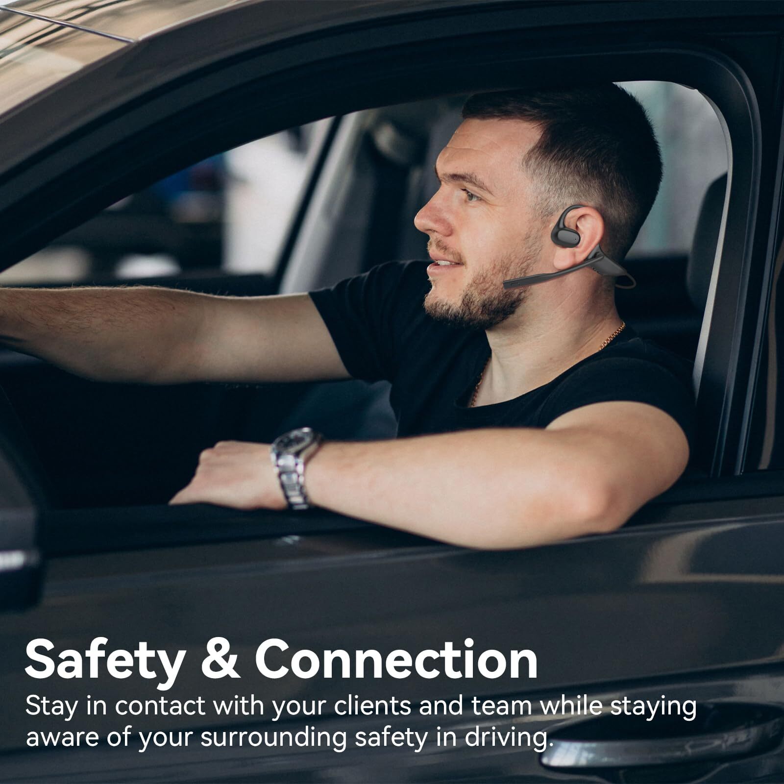 Excellent Sound Quality and AptX-Adaptive: This headset with mic is equipped with the advanced Qualcomm QCC3040 Bluetooth chip and the most advanced AptX Adaptive Lossless Audio codecs, ensuring a stable and swift signal transfer, minimal power consumption and low latency. Our bluetooth headphones with microphone deliver clear and vibrant hi-fi stereo sound that surpasses the nuanced and dynamic audio produced by bone conduction headphones Upgrade Air Conduction Headset: The headphones with microphone use advanced air conduction technology, delivering sound waves to the cochlea through the air without compromising the original audio quality, allowing you to effortlessly savor superior music. Additionally, our open ear headphones wireless bluetooth weigh only 30 g, making you barely feel it on your head. There's no vibration and doesn't cover your ears, providing you with strong comfort AI Noise Cancelling and Mute Button: The open ear headphones employ advanced environmental noise-canceling technology to accurately capture your voice while effectively blocking out surrounding noise. This ensures clearer and louder calls even in noisy environments, enhancing communication efficiency. Moreover, the Mic Mute key allows you to turn the mic off and on with One Press during calls. It's an essential feature for business meetings Open-Ear Safety and Dual Connection: The open-ear design of this open ear bluetooth headphones prevent the discomfort associated with both in-ear and over-ear headphones. It keeps your ear canal clean and healthy, protecting your eardrum and helping your ears stay alert for safety. Moreover, this wireless headset with microphone for pc supports dual connections, enabling simultaneous connectivity with two devices to ensure you never miss a call Multifunction Button and Long Battery Life: The headsets with microphone for work have a versatile button for easy control power on/off, play/pause, voice assistant activation, and answering, hanging up, or rejecting calls. Built-in 150 mAh battery, you can enjoy up to 12 hours of music playback and 100 hours of standby time. Just need 2 hours charge. Revel in your music without concerns about battery life(Note: Not suitable for use while charging)