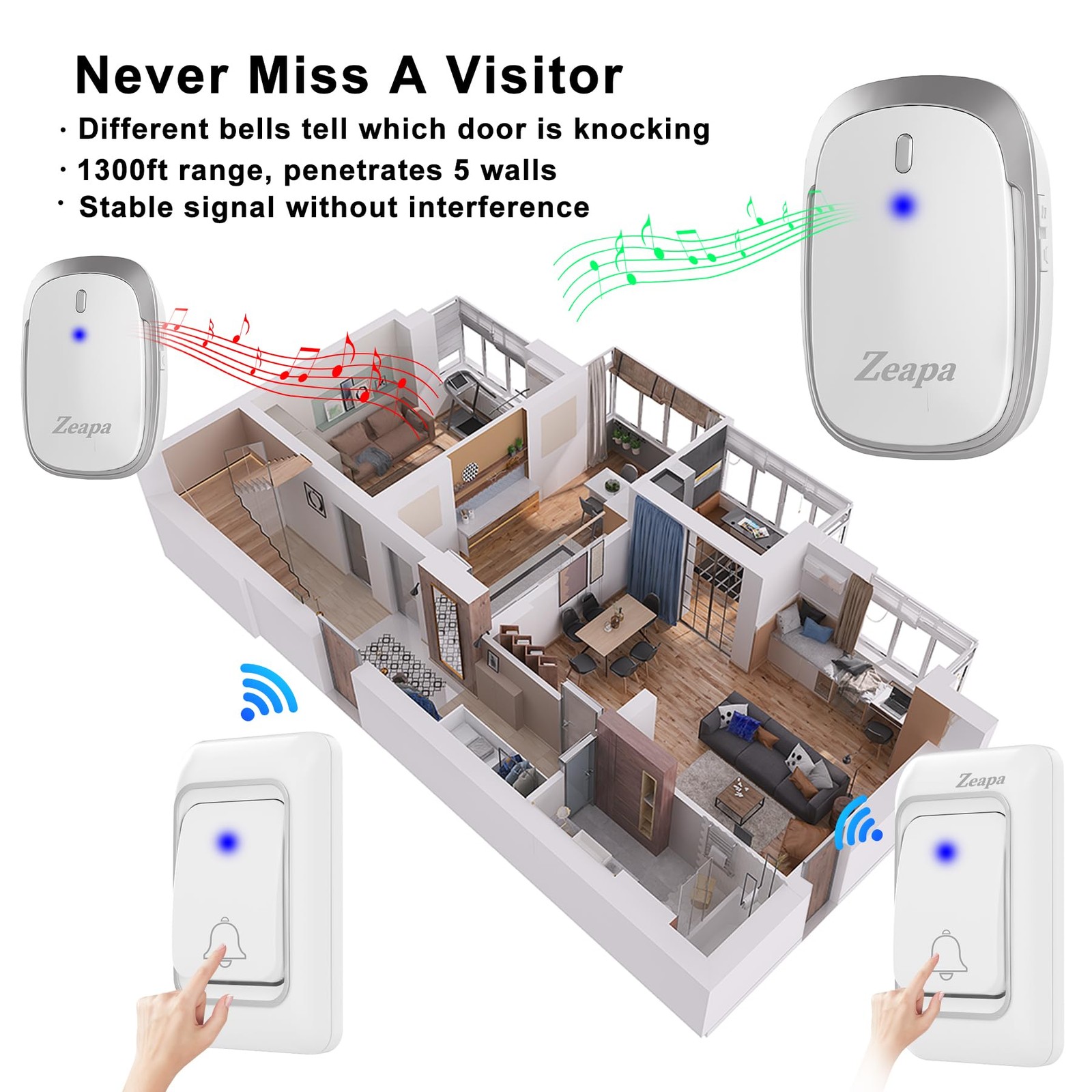 A Higher Quality Plug-in Wireless Doorbell Specifications: ● Receiver Operating Voltage: AC 110- 220V. ● Insert Type: US Protruding Plug. ● Receivers Operating Power: 0.1W ● Transmitter Power: 1pcs 23A 12V alkaline battery, 230mAh (Installed already). ● Transmitter Battery Lifetime: Up to 3 years. ● Operating Range: 500-1300 feet. ● Operating Frequency: 433.92MHz with tolerance 280KHz. ● Operating Temperature: minus 22-158 Fah or minus 30-70 Celsius. ● Led Indicator: 1pcs, embedded in the transmitters and receivers respectively. ● Sound Volume: 4 adjustable volumes with 25-115dB in cycles. ● Waterproof Grade: IP55. ● Ringtones: 58. ● Receiver Weight: 2.1 Ounce ● Transmitter Weight: 1.4 Ounce ● Receiver Size: 3.7x2.5x0.8 inch ● Transmitter Size: 3.11x0.98x0.83 inch ● Product color: Ivory White+Silver ● Installation: 1)Use Sticky Pad to Adhere; 2) Use Screws to Fix Package includes: ● 2pcs plug-in receivers. ● 2pcs transmitters (battery installed). ● 4pcs long screws with compatible anchors. ● 4pcs sticky pads. ● 1pcs User Manual. Ultra-Long Wireless Range: Our wireless doorbell boasts an impressive range of up to 1300 feet (approximately 300 meters), FCC-certified 2.4GHz digital transmission ensures reliable performance, ensuring you never miss a visitor, no matter the size of your home. Diverse Multi-Chime Options: With 60 melodious chimes to choose from, catering to various tastes and needs. Whether it's classical music, modern tunes, or natural sounds, there's a perfect chime for everyone. Adjustable Volume Levels: Featuring 4 levels of volume control, you can customize the sound to suit your environment and preferences. This ensures you hear the doorbell clearly at all times, without disturbing family members or neighbors. Waterproof & Durable Design: Crafted with high-quality waterproof materials, our doorbell performs flawlessly in rainy or humid conditions. Its robust construction stands the test of time, safeguarding your home security. Easy Installation & Operation: No professional tools or skills required for installation. Fully wireless system installs in minutes using adhesive strips or screws, featuring automatic frequency pairing between push button and chime unit. The user-friendly interface makes it simple for anyone, including seniors and children, to operate with ease. Bring convenience and security to your life. Differentiate Various Doors: Featuring 60 different melodies, allowing you to customize and differentiate each doorbell for different doors based on their unique sounds. LED Indicator for Visual Alert: Equipped with an LED indicator that lights up when the doorbell is pressed, providing a clear visual signal even in noisy environments. 3-Year Battery Life: Powered by long-lasting alkaline batteries for maintenance-free operation (actual lifespan may vary with usage frequency) No Hidden Costs: One-time purchase with zero monthly fees - works like a standard doorbell without subscription commitments Stylish Silver Design for Versatile Use: The elegant silver finish not only looks great but also blends seamlessly into home, office, or store settings, adding a touch of modernity to your space.