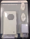 NEW******Wireless Plug-In Smart Doorbell Kit 21659 - 2 white doorbell Buttons #1001477889****20 AVAILABLE ***Compatible with Non-Hampton Bay Wireless Push Buttons Only Wireless Smart Doorbell Kit -Sends Mobile Alerts -Three Selectable Tunes with Volume Control -Off White chime unit plugs into any 2 prong outlet plug. -No wiring needed for battery operated door bell buttons. -Up to 150ft transmission range p -Chime 6in W x 3.5in L x 1.2in H -2 Oval Off White Wireless Push doorbell Buttons: 1.2in W x 2.5in L x 0.7in H Kit Includes: -Chime -Power Adaptor -2 Lighted battery operated Wireless Off White Push doorbell Buttons (batteries included) -Mounting Hardware