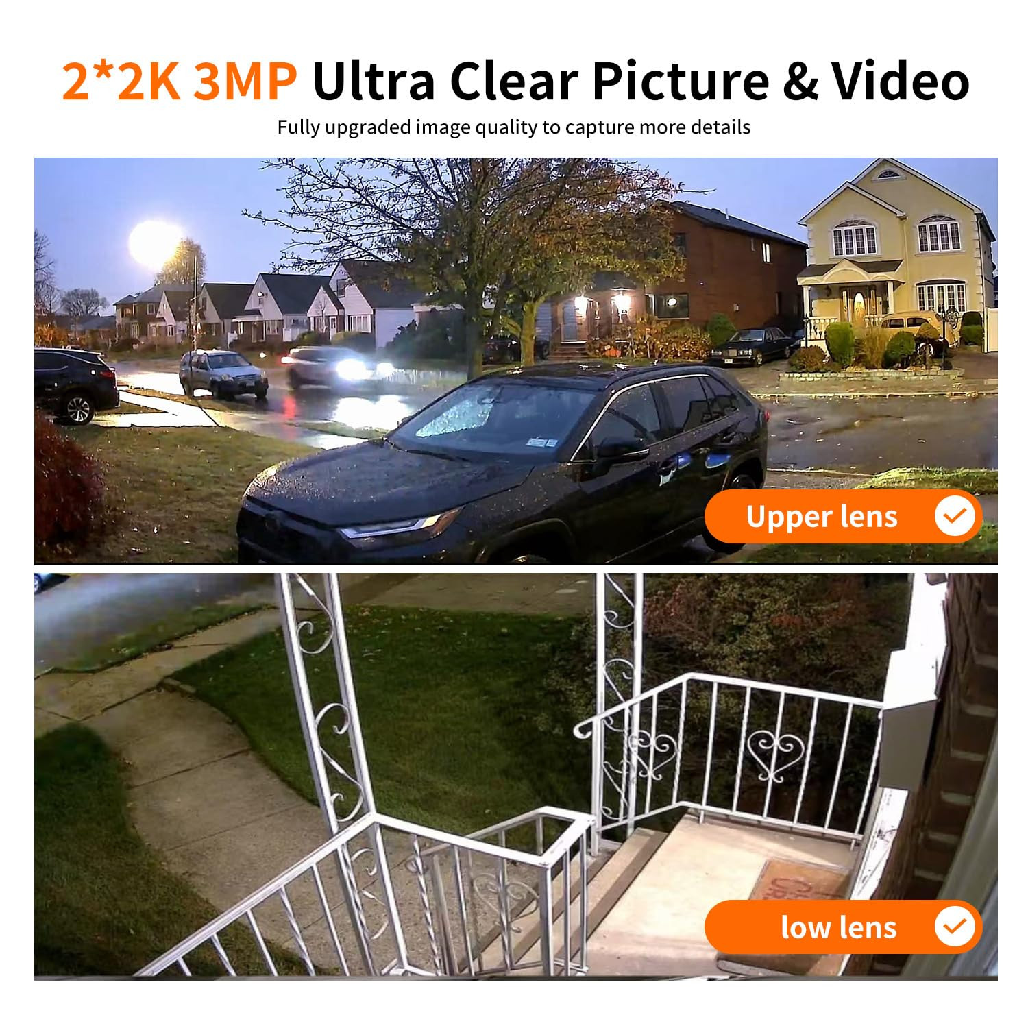 【1 Device = 2 Cameras,2*2K Ultra HD Resolution & Color Night Vision】Security Cameras Wireless Outdoor has two lens. 2 lens view cover 360°,Each lens is 3MP/2K with sharper colors and details, allowing you to see everything that is happening within your surveillance area. One camera but function as 2. The camera is built-in 8 leds, the light could be set to motion triggle on or always on at night or close,and when the lights are on at night, extraordinary color night vision adds a glow to every dark night. 【PTZ and Dual Lens & 360°Coverage】The outdoor PTZ dual lens camera, The fix upper lens monitor the key area, ,the lower lens: supports 330° horizontal rotation and 90° vertical rotation, you could remote rotate camera view angel in your app and also the lower lens accurately sense the moving target,until the target is out of the field of view of the wifi camera,then turn back to its care view position. 【Easy Use &100% Wireless& Support 2.4GHz and 5G 】This outdoor camera comes with solar panel, rachargeale battery and built in wifi.Solar panel recharge battery, battery power camera when there is nu sunshine, wifi antena connect to your home 2.4Ghz/5G wifi routher.100% wireless free,no wire hassle. No need power plug-in. Mount the camera on the wall, then you could start 365 days surveillance. Very friendly for new user. (The user manual may incorrectly state that only 2.4G is supported; please disregard that information)This cameras for home security. 【 Two-Way Audio & Multi-user Sharing 】This cameras for home security built-in microphone and big volumn speaker, so that you can remote talk to the person who in camera,speaker volumn big enough.This home surveillance camera support multi users login. You could share camera access to your familers, so you all could liveview or playback camera at same time. 【 Auto Alarm & Motion Zone & IP65 Weatherproof 】When the camera detects the movement,you could set it auto alarm, suitable for when you are at vacation in another city, help you scared away invade. Come with motion detection function, when there is motion, you could set to get alert information only when motion happen in you marked zone. It is for free. Othes camera charger for this function.This IP66 weatherproof camera withstands rain, snow and high temperatures.