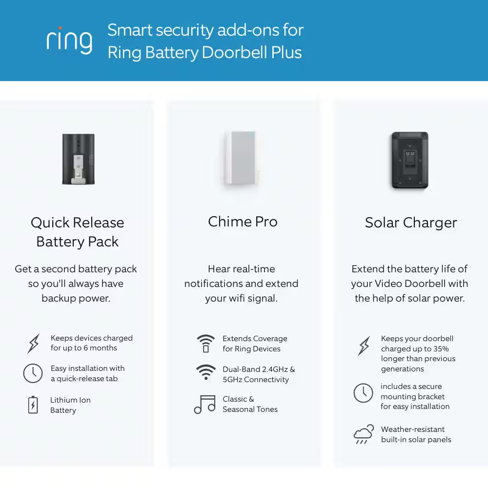 Battery video doorbell with Head-to-Toe HD+ Video in 1536p Battery powered indoor/outdoor security camera w/ 1080p HD video 2-way talk, mobile notifications, customizable motion zones Stay in the know from head to toe with Battery Doorbell Plus, our upgraded doorbell with super clear HD+ video and a taller Head-to-Toe field of view compared to the previous generation. Get important alerts with Package Alerts, an exclusive Ring Protect subscription feature that notifies you when your package is detected within a specified zone. And if you're busy, you can save time and ask visitors to leave a message with pre-selected Quick Replies.