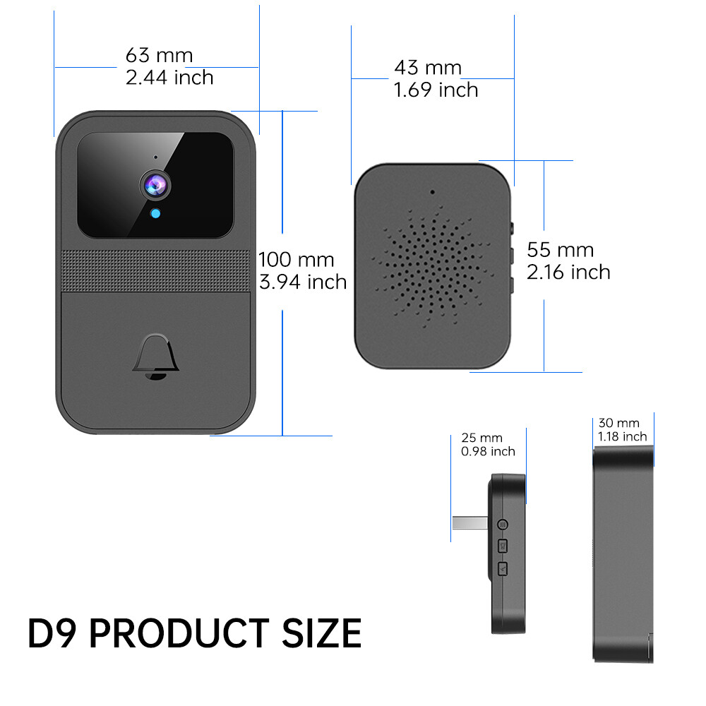 Product Description Doorbell Wireless with Chime, Wifi Video Doorbell, 2-Way Audio, Night Vision, Motion Detection, Cloud Storage, Black Specifications: Product name: Doorbell Camera Wireless with Chime Color: Black Material: ABS Battery Needed: AA battery x3 (NOT INCLUDED) Use time: normal use of more than 3 months Standby time: about 1 year Intercom type: color visual Camera resolution: 480 x 640 Size of doorbell machine: Length * width * height:3.94x 2.44x1.18inch/100x62x30mm Ding dong machine size: Length * width * height: 2.17x1.65x0.98inch/55x42x25mm (including USB: 12mm height) Equipment weight: Doorbell machine net weight: 84.2g Ding dong machine net weight: 23.3g Descriptions: WiFi Connectivity: The video doorbell camera features WiFi connectivity, allowing you to connect it to your home network and access it remotely using your smartphone or tablet. Chime Included: This video doorbell camera comes with a chime unit that can be placed in your home. When someone rings the doorbell, the chime will emit a sound to alert you, ensuring you never miss a visitor. 38 ringtones are available for the chime rings. Wireless Design: With a wireless design, installation is hassle-free and does not require any complicated wiring. The doorbell camera can be easily sticked on your front door or entrance, providing convenience and flexibility in placement. Battery Powered: This smart video doorbell is powered by batteries (batteries not included). This eliminates the need for complicated wiring or access to electrical outlets, making installation and maintenance simple and convenient. Cloud Storage: The doorbell camera offers cloud storage capabilities, allowing you to store and access video recordings remotely. Package Included: 1 x Doorbell 1 x Chime Instruction manual Notice: Please allow 0.5-1 inch difference due to manual measurement.(1inch=2.54cm) Due to the different display and different light, the picture may not reflect the actual color of the item. Thanks for your understanding. powered by