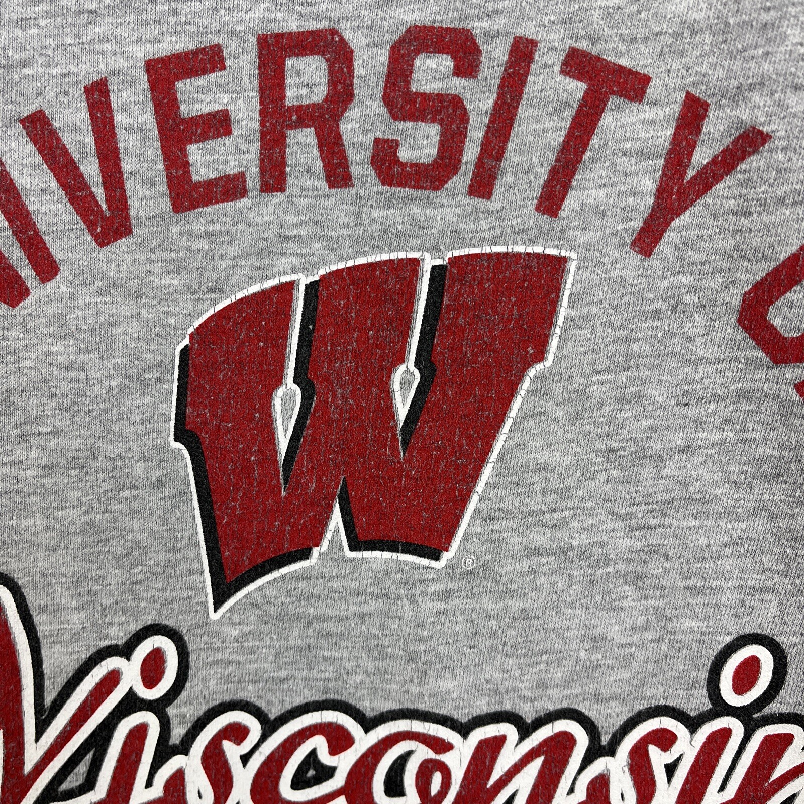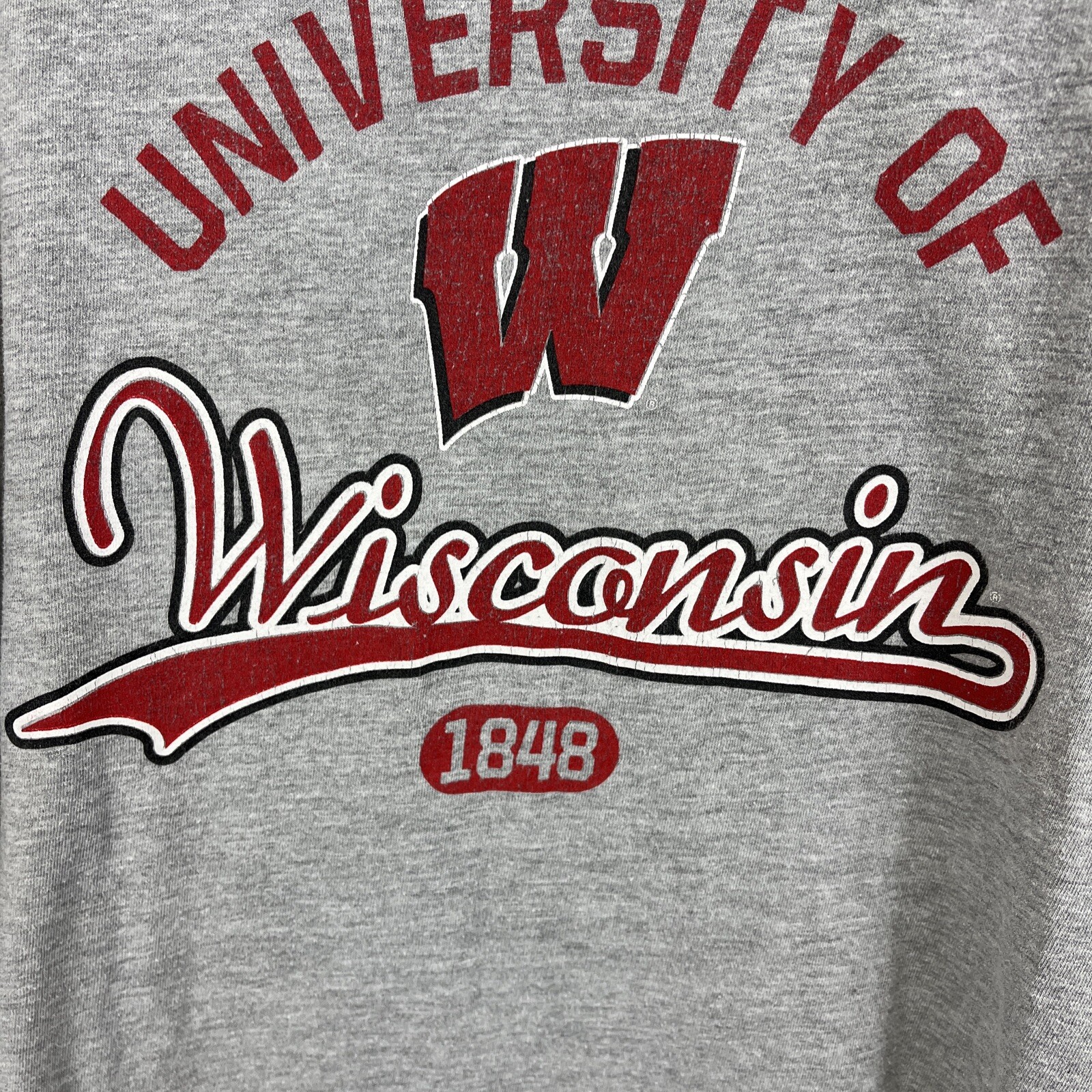 Wisconsin Badgers TShirt NCAA College Gray Long Sleeve Adult Lrg Cadre Athletic. Condition: good Preowned, no holes or stains, has some light fading on the graphics. Size tag is worn fits around size large, a little short. Measurements are 21” pit to pit and 27” collar to front. Ships usps ground advantage.