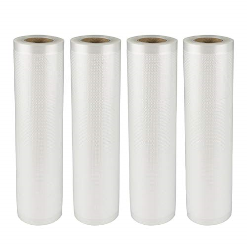 vacuum sealer bags rolls are made of advanced composite material, BPA free. Special structural characteristics innovation offer them ideal vacuum property, they will keep your foods fresh and expand foods lifespan. How to use: Cut vacuum sealer bag rolls into the size you need Insert one end of bag into vacuum sealer machine to seal, MAKE SURE IT’S SEALED PERFECTLY, OR IT COULD NOT BE VACUUMED Put your food into bag, insert another end into machine, and start to vacuum seal Features: BPA free, safety food materials, greatly extend storage time One side clear, another side embossed –excellent vacuum property, perfect for resale of goods No markings on bag–Easy writing area for labeling Boilable Freezable Reusable Microwave Safe Dishwasher Safe Warranty: 30-Day Money Back Guarantee GREAT VALUE: Half of the money to buy 4 pack of 11 inch x 25 feet vacuum sealer bags rolls, total 100 feet. No pre-cut design, creating your own length of bag. Less food wasted, much money saved. BETTER DEAL HEAVY DUTY & STABLE: Two layers 4 mil heavy-duty vacuum seal bags with Two-Side Embossed air-removal channel which are stable for heat and cold, boilable, freezable, microwave and dishwasher machines. SAFETY MATERIAL: Vacuum seal bags are BPA Free, durable, quality material. Simmer and Microwave Safe. Protect your and your family’s health Fit Inside Machine: These Rolls fit most vacuum sealers' chamber. Compatible with all household and commercial vacuum sealers. Great to use for Sous Vide Cooking. DOUBLE SEAL WET PRODUCTS NOTICE: Plant cell respiration can produce carbon dioxide in the bag. It seems that the bag leaks air or not sealed if you store raw vegetables or fruits. IT'S NOT A PROBLEM OF BAGS