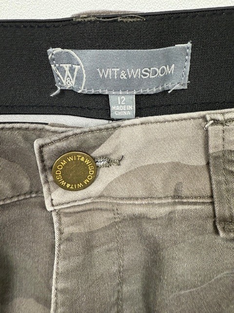 Wit & Wisdom Ab’solution High Waist Camouflage Pants features high rise, front t tummy panel and the perfect wash for every day wear! Size: 12 Front Rise: 10” Inseam:27.5” Waist: 17.5” Gray neutral camouflage color •zip fly button closure •tummy control panel •excellent preowned condition Refresh your wardrobe with these chic Wit & Wisdom Ab-Solution High Waist Camouflage Ankle Skinny Jeans in Women’s Size 12 . These jeans combine flattering shaping and comfort thanks to the brand’s signature Ab-Solution stretch waistband. Condition: Excellent pre-loved — clean, no stains or holes, minimal wear. Comes from a smoke-free home. Features: Brand: Wit & Wisdom Style: Ab-Solution High Waist Ankle Skinny Jeans Size: Women’s 12 Pattern: Camouflage / Camo Fit: High-waisted, skinny leg, ankle length Stretch fabric for comfort and a slimming silhouette Shape-enhancing waistband that flatters waist and hips Versatile — great for casual outfits, nights out, or everyday wear Perfect For: Everyday wear Casual chic outfits Pairing with tops, sweaters, jackets, or tees