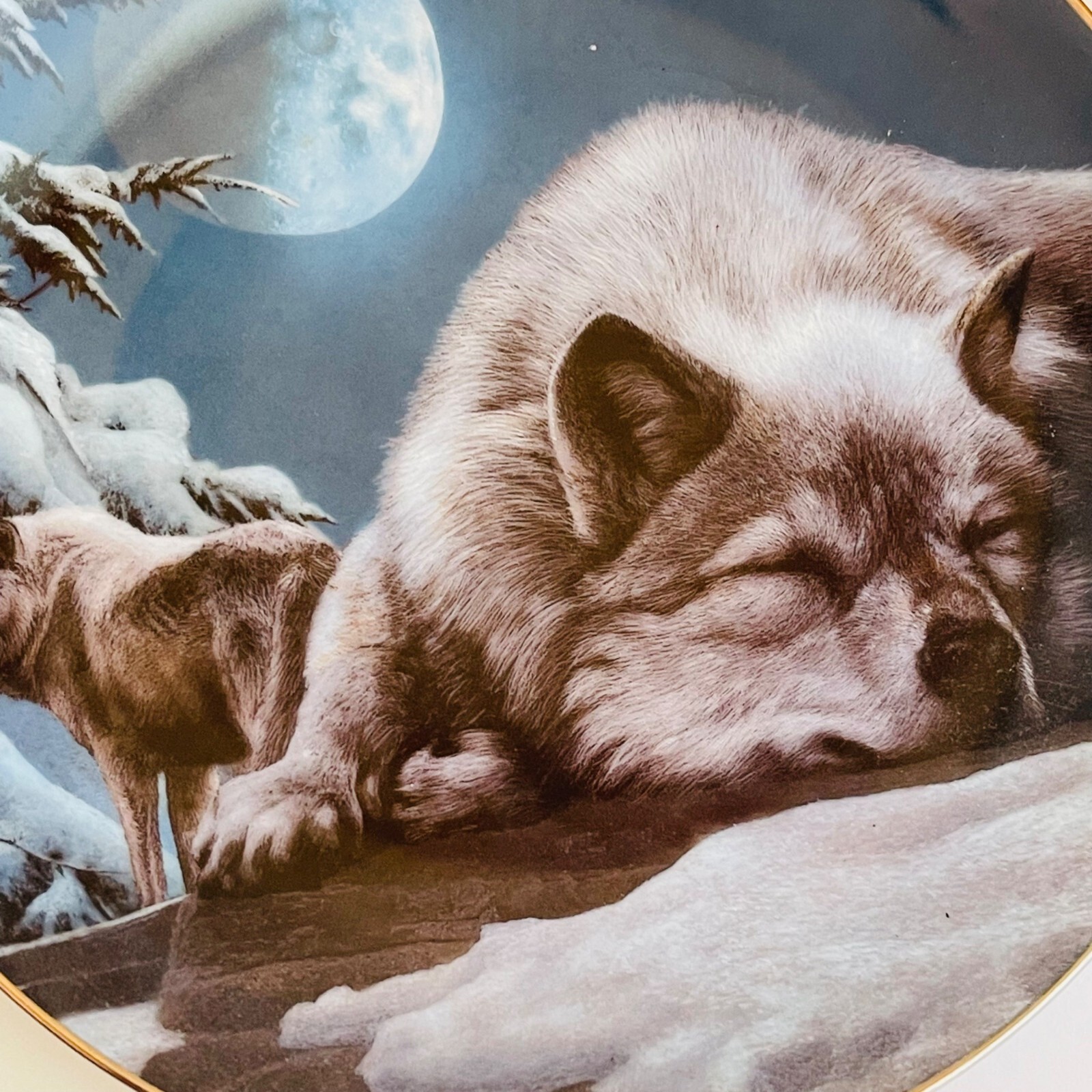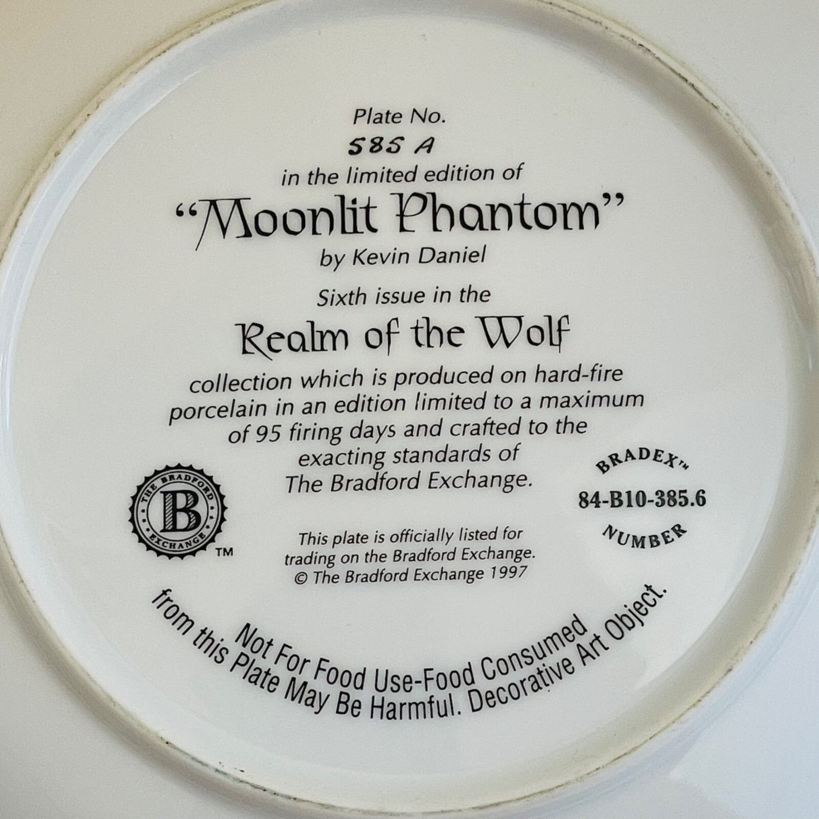 Vintage Wolf Plate by Kevin Daniel from the Realm of the Wolf Collection - Bradford Exchange 1997. Plate number 585A. Just over 8" wide. This plate is in excellent condition with no cracks or chips. I have several wolf plates available. I am happy to combine shipping. Shipping weight is just under 2 pounds from Florida