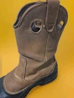 No cracks or creases. The soles look good. Maybe some deep cleaning for the leather is needed. Step into the outdoors with confidence in the Wolverine Swampmonster Waterproof boots. Designed with a solid brown leather upper and a mid-calf shaft style, these boots offer a classic look that's both durable and waterproof. Perfect for workwear, the easy pull-on design ensures convenience and comfort for those on-the-go days. Crafted to meet the demands of any active lifestyle, these boots feature a robust construction with a supportive midsole and a sturdy outsole for reliable traction. The Wolverine Swampmonster Waterproof boots are a steadfast choice for anyone seeking functionality without compromising on style.