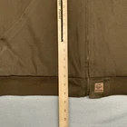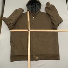 The Wolverine Work Jacket in XXL is a heavy, quilt-lined jacket with a hood and full zip closure, designed for durability and warmth. Made of cotton with a polyester lining, this mid-length jacket is suitable for various occasions such as workwear, casual outings, and outdoor activities like hiking or hunting. It features multiple pockets for convenience and has a solid brown color with accents like zippers and logos. Machine washable and sized for a chest of 58 inches, this jacket combines functionality with a rugged style that is perfect for the fall and winter season.