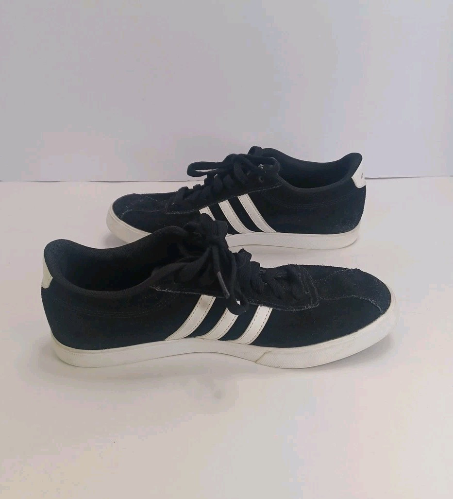 This product is a black and white Adidas Courtset sneaker for women, with a US shoe size of 8. The upper material is made of leather. The style code is B44619 and the product line is also Adidas Courtset. The shoe is designed to be athletic and has a colorful theme.