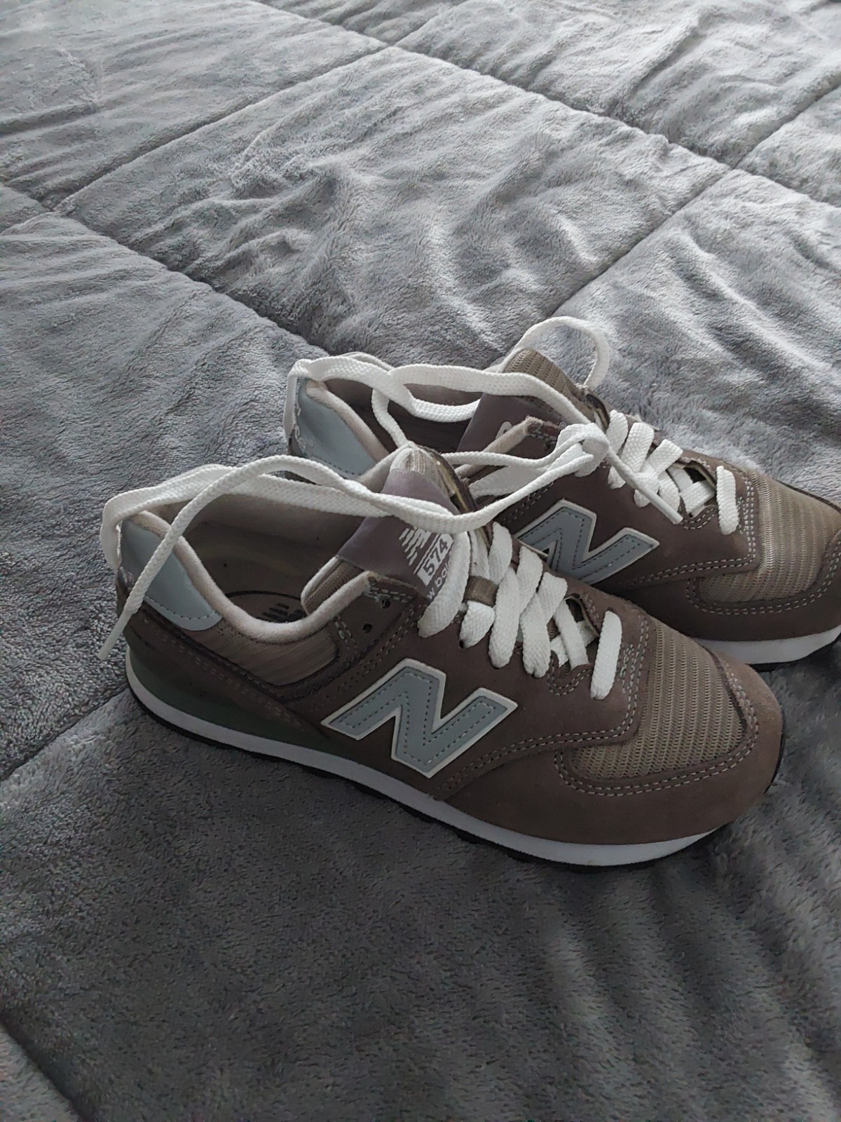 these 574 were not worn outside look at condition they were worn for photos pictures are clear nice condition very clean won't dissappimt at all!!