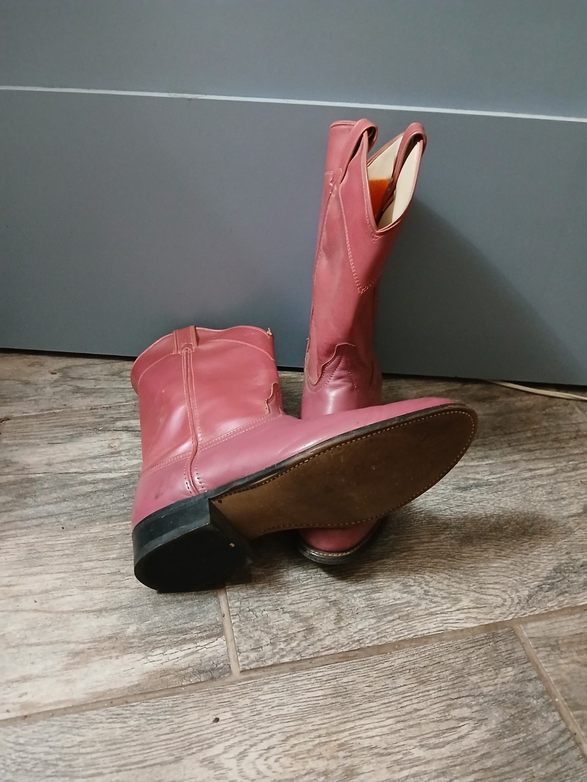 These women's size 10 pink cowboy boots feature a mid-calf shaft style with a pointed toe and a pull-on closure. The low block heel and rubber outsole provide comfort and support for casual occasions. Made of leather, these western-themed boots are perfect for the fall, winter, and spring seasons, adding a touch of cowgirl character to any outfit. Gently used condoning as shown in pictures.