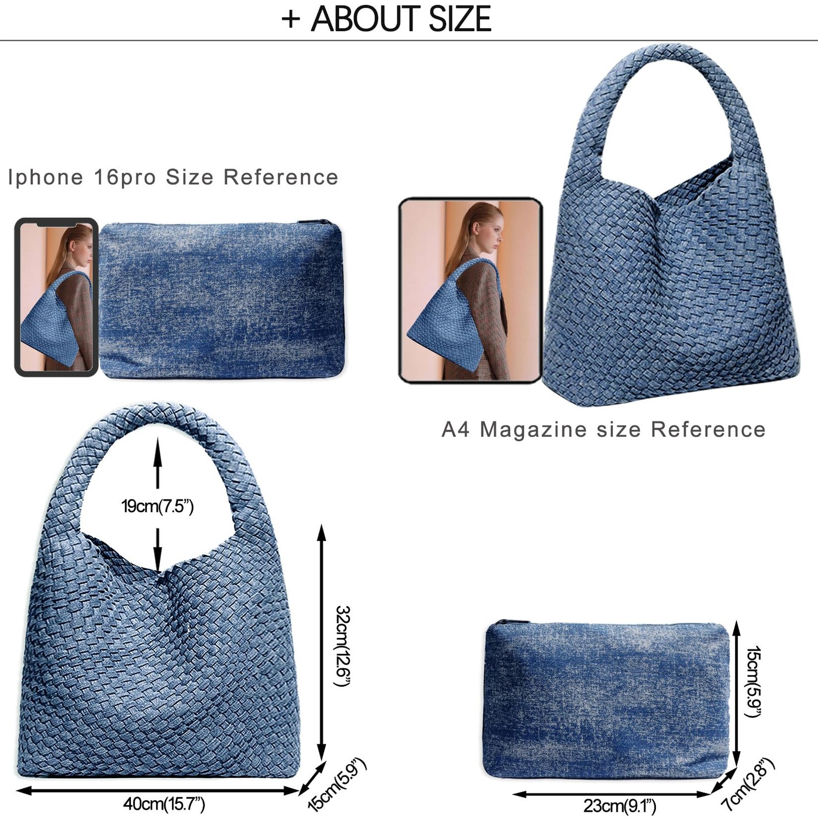 1, Material:The handbag is made of soft high-quality vegan leather. We choose the good leather to make sure the quality are all good. However because of many types of leather, our effect processing would be different.The leather has different texture, depth, some natural scar and fold. It would no absolute perfection. Only the fake leather's texture without any defect. 2, Handmade Craft:All the bags are handmade in our shop and may have slight natural skin marks /workmanship defects /metal flaws. Especially the patchwork handbag which are all made by different hands, so please understand that we can not keep every one same exact same as we show but we make sure we try our best. 3, Smell:The leather bags would have a little smell because of the leather&glue. We have no time to do the air handing and the bags would be put into the sealing packing after it finish. It is a normal phenomenon. We are sure it will go away after days. If you were allergic to it , please consider more carefully. 4, Design:Pure hand-woven tote bag.The bag is soft and durable.With a large capacity design.A bag in a bag.Buy a bag and get two bags,practical and cest-effective. 5, Size and Color:Due to the different way measurements, please understand that it might be 1-3cm errors. Also different computer screen and different mobile will be a little bit different for same color, so please allow reasonable color difference. 【 Fashion Washed Denim Material】 - The handbag is made of customized washed denim, and the fabric itself is woven with coarse twill fabric. Natural dyes (not washable, can only be dry cleaned) have a natural and decadent color tone. The retro style of the 1980s. This woven bag features an admirable appearance by interweaving two or more strands of leather into a fixed pattern. Exquisite weaving details run through the entire framework; Inside is a makeup bag of the same color scheme. 【Chic Retro Style】- Every JINMANXUE Bag is designed by experts keeping in mind the best interests of the customers. In today’s fast world, we are all always on the go, which makes it very important that we carry all our necessities while we are on the go. This Bag has ample detailed compartments to fit in all your daily necessities and is also comfortable to be carried at the same time. 【Dimension】 - Main Pockets: 15.74 " W x 5.90" D x 12.59" H. Interior Pockets: 9.05" Wx5.9" D and can be worn as a pouch or detached and used as a wristlet(Because it is hand-woven, the size has a little error within the normal range, if you mind, please shoot carefully), such as cellphone for any size, mini iPad, keys, sunglasses, small books, jewelry, wallet, cosmetics and other necessities.Our woven bag offers both comfort and elegance and is the perfect handbag for women on the go. 【Convenient Design 】- This Woven Hobo Bag can be used as purse, handbag and Crossbody Cell Phone shoulder bag. The armhole is big enough to wear it as a shoulder bag if you don’t wear something very thick such as a thick jacket or sweater. Retro tote bag style ,with unique handbags handle, simple and leisure, elegant and fashionable, most suitable for tourism, shopping and seaside. Green, natural healthy material keep you cool, comfortable and safety when carrying it in a hot summer. 【Go with Any Styles】- It raises the level of clothing because it looks like the bags that fashion bloggers or writers would wear during fashion week. It is a perfect carry-all for every day, our eye-catching handbag with matching wristlet is made of durable fabric with sturdy shoulder straps for extra comfort and style and is perfect for every occasion, wear it to office or weekend brunch dates, events, parties.