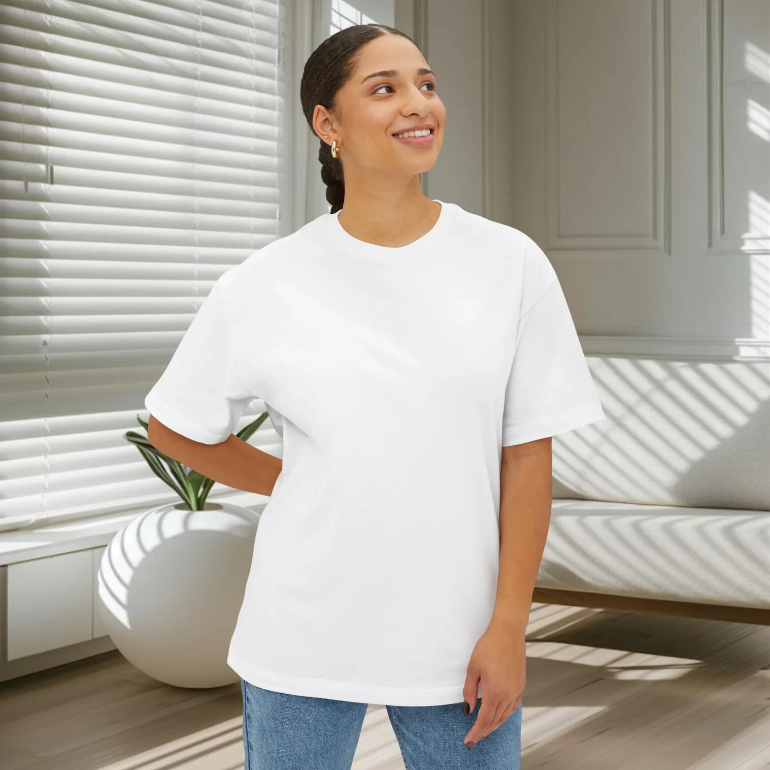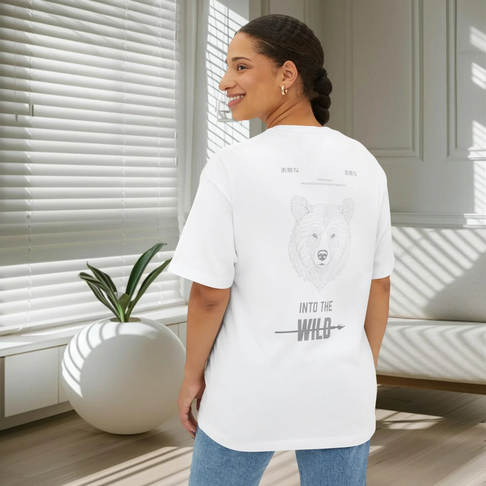 Elevate your wardrobe with our Women's Inspirational Graphic T-Shirt. Our oversized, back-printed design features empowering imagery that will uplift and inspire. Made with high-quality materials, this T-shirt is not only stylish but also comfortable and durable. Perfect for everyday wear or for a bold statement piece. FOR OVERSIZED LOOK PLEASE CHOOSE ONE TO TWO SIZES UP THAN YOUR USUAL SIZE DEPENDING ON YOUR CHOICE. Overview: Comfort and style are the name of the game for these custom boxy t-shirts. Their relaxed fit along with the dropped shoulders add that modern aesthetic that can blend into any occasion. Fabric: 100% airlume combed and ring-spun cotton (fiber content may vary for different colors. Medium fabric (6.0 oz/yd² (170 g/m²)). Fit: The relaxed fit keeps the wearer comfy in both casual and semi-formal settings while the crew neckline delivers that classic, neat style which makes it perfect for accessorizing. Fabric blend: Solid colors are 100% cotton; Athletic Heather is 90% cotton, 10% polyester.