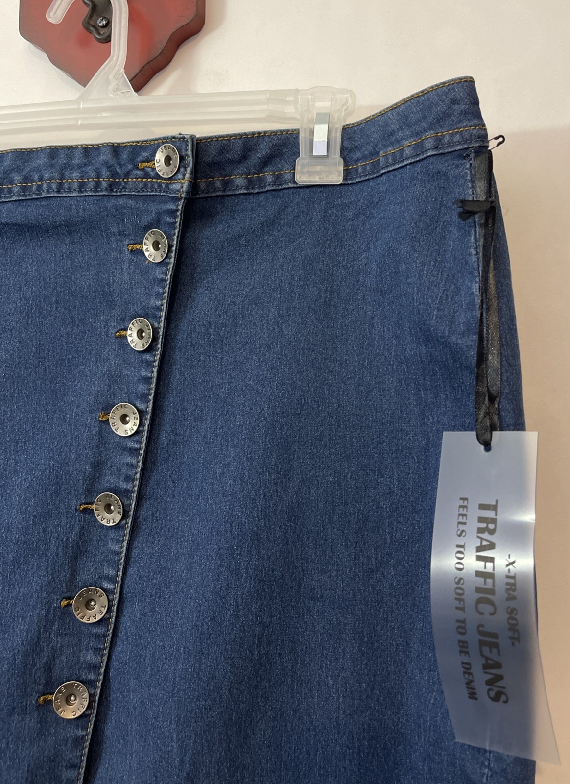 These Traffic Jeans Women's 22W Blue Super Soft Knee-Length Skirt is a stylish and comfortable addition to any casual wardrobe. Made from a blend of polyester, spandex, rayon, and cotton, this skirt features a button closure and a solid pattern in a classic blue color. The knee-length design and stretchy fabric make it perfect for all seasons, while the straight and pencil style adds a touch of sophistication. Whether you're running errands or meeting friends for coffee, this skirt from Traffic Jeans is sure to become a versatile staple in your closet. Length: 23 inches. Waist: 20.5 inches across laying flat.