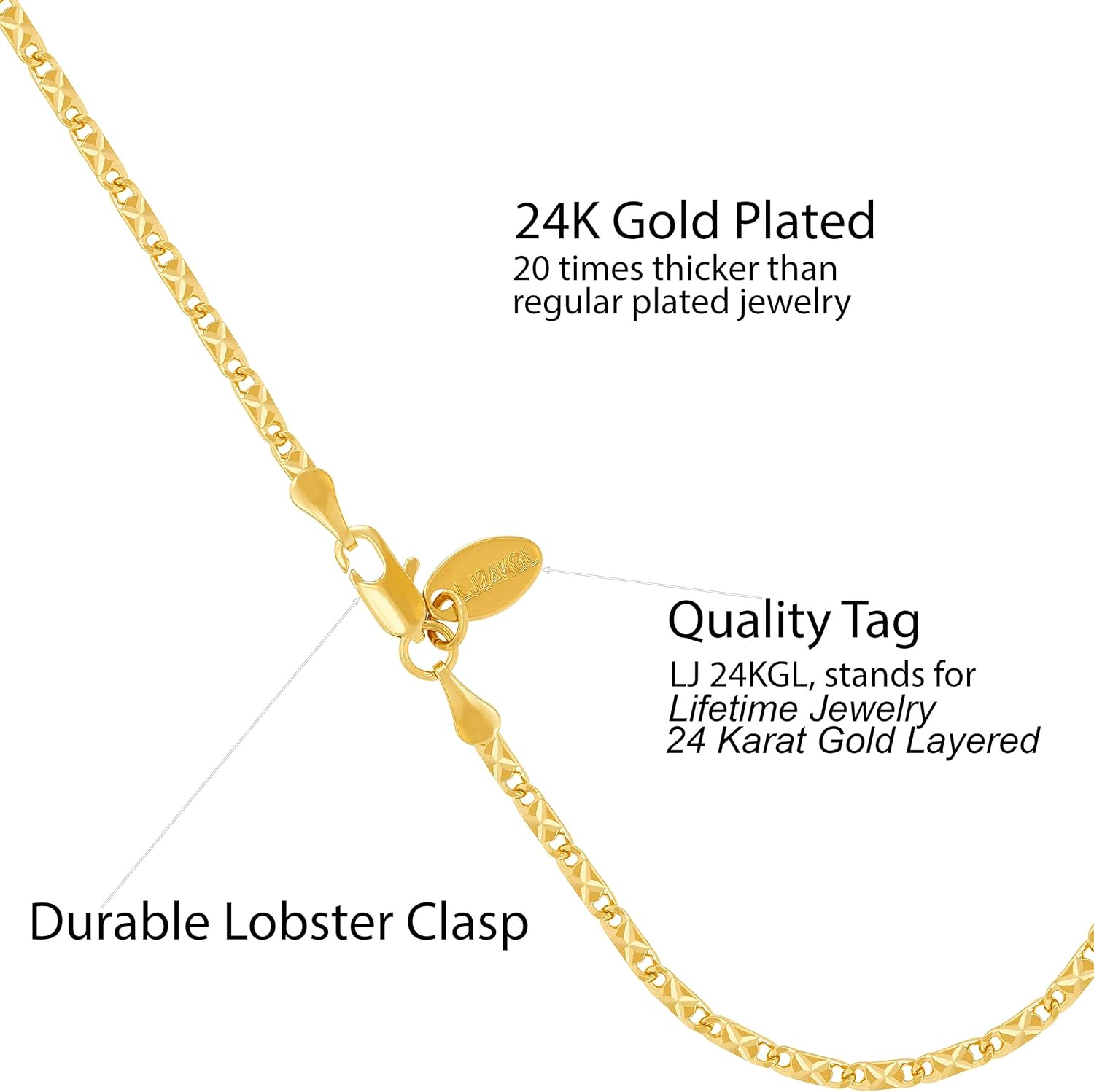 Womens Gold Anklet 2.5mm Star Flat Link Ankle Bracelet 24k Gold Plated Product Description Have the look and feel of solid gold at a fraction of the cost ! Lifetime Jewelry 's Gold 2.5mm Diamond Cut Star Flat Link Chain Anklets are made to last. Made of real 24K gold laid over a core of jeweler's bronze, there is up to 20 times more gold than electroplate. This helps make it last and gives it the look of quality. YOU CAN BUY EXPENSIVE SOLID GOLD JEWELRY , but would you wear it to the beach? Probably not, right? Wear our anklets anywhere, anytime! Easy to replace if lost or stolen. Wear them at a party or even high class formal occasions. Lifetime Jewelry anklets LOOK AND FEEL LIKE SOLID GOLD . We are real people who use our own products every day We expect the best for our families and want the same for yours We cut no corners in our products, and will cut no corners in our support to you Proudly made in USA Item model number 50A 2.5mm Diamond Cut Star Flat Link Metal stamp 24K Chain Other Chain Type Gem Type no gemstone Material Metal Metal yellow-gold-plated-bronze Model number 50A 2.5mm Diamond Cut Star Flat Link Length 10 inches Item Display Length 10.0 Inches Department boys Metal Type yellow-gold-plated-bronze Is Discontinued By Manufacturer No Package Dimensions 3.5 x 2.5 x 0.55 inches Clasp Lobster Claw 2.5 inches x 3.5 inches x 0.55 inches. Shipping from the USA All of our products are shipped from the USA, ensuring quick delivery to your destination. Payment We offer the following payment methods: PayPal, credit card, bank transfer, and eBay's secure payment system. Free Shipping & Free Returns Shipping within the USA is FREE. Additionally, any return is absolutely free for you. Risk-Free Purchase You have the option to return an item within 30 days without any justification. We cover the return shipping costs! Fast Shipping We ship immediately upon receipt of payment. Generally, the package is delivered within 2-3 days in the USA. If it takes longer, we will contact you. Quality and Costs Made in Europe, USA, China No customs fees or additional charges Total satisfaction guarantee Invoice with declared VAT available upon request in .pdf format Feedback Your feedback is very important to us. After you pay for your purchase, you will automatically receive positive feedback from us.