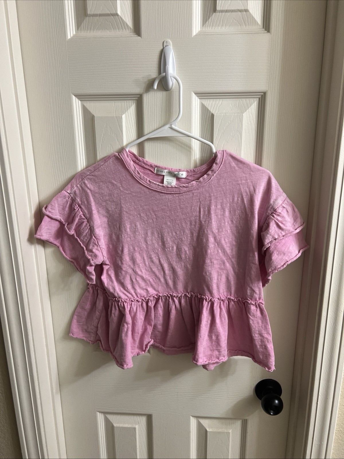 The Women's Altar'd State Juniper Ruffle Top in pink,size XS, is a stylish blouse designed for women. Featuring a feminine ruffle accent, this top comes in a pink color that adds a touch of glamour to any outfit. Made by the brand Altar'd State, this blouse is perfect for those looking for a chic and trendy addition to their wardrobe.